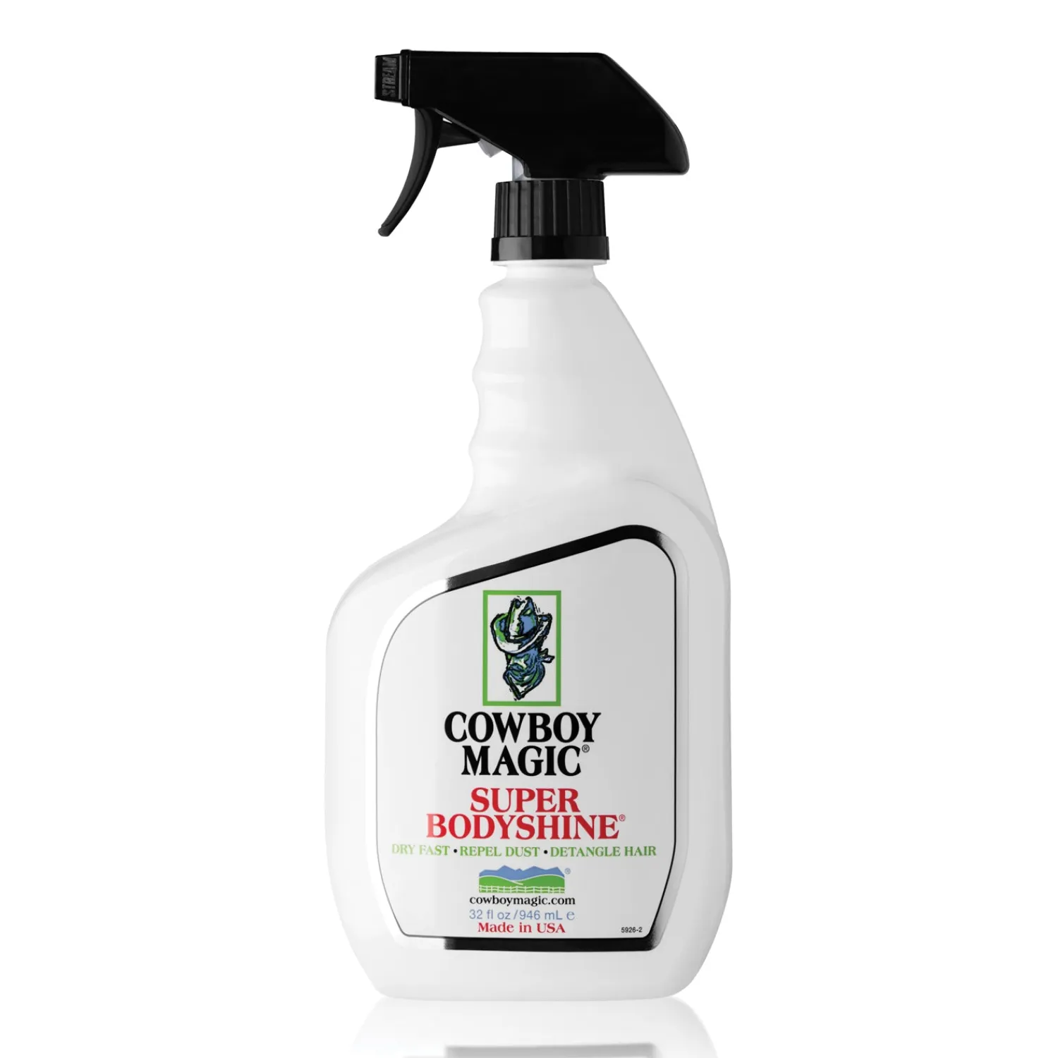 Cowboy Magic® Super Bodyshine® for horses is formulated to give hair a super shine. It helps repel show ring dust and dries fast. Concentrated and ready to use, this coat polish has added aloe vera to strengthen and condition hair and skin. 32 oz.