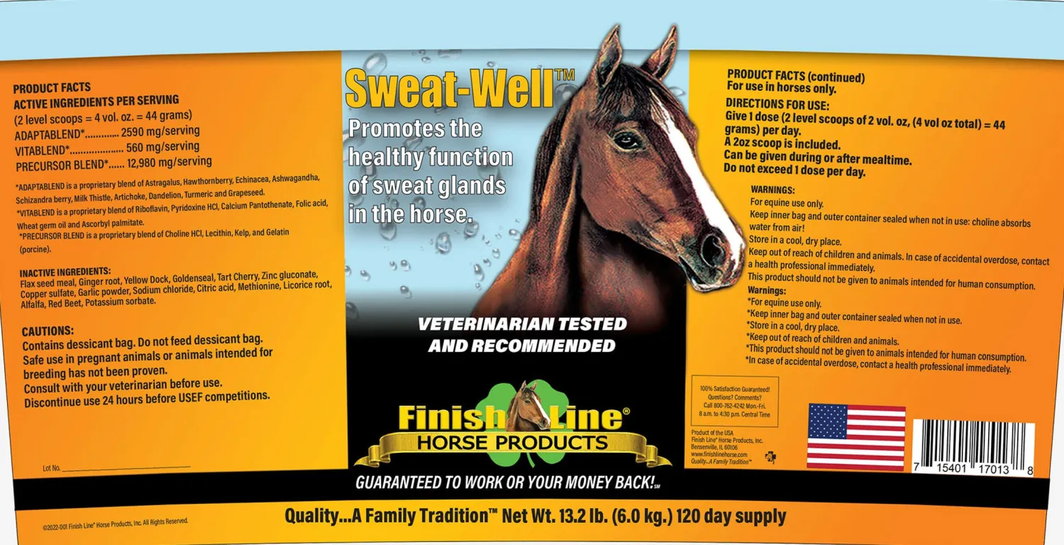 Finish Line® Sweat-Well™ is a powdered formula designed to help promote healthy functioning of sweat glands in horses. Developed for non-sweaters, this comprehensive formula supports seven different systems that affect sweating in the horse. These include the liver, immune system, adrenal glands, kidneys, metabolic system, nervous system and neurotransmitter precursors.