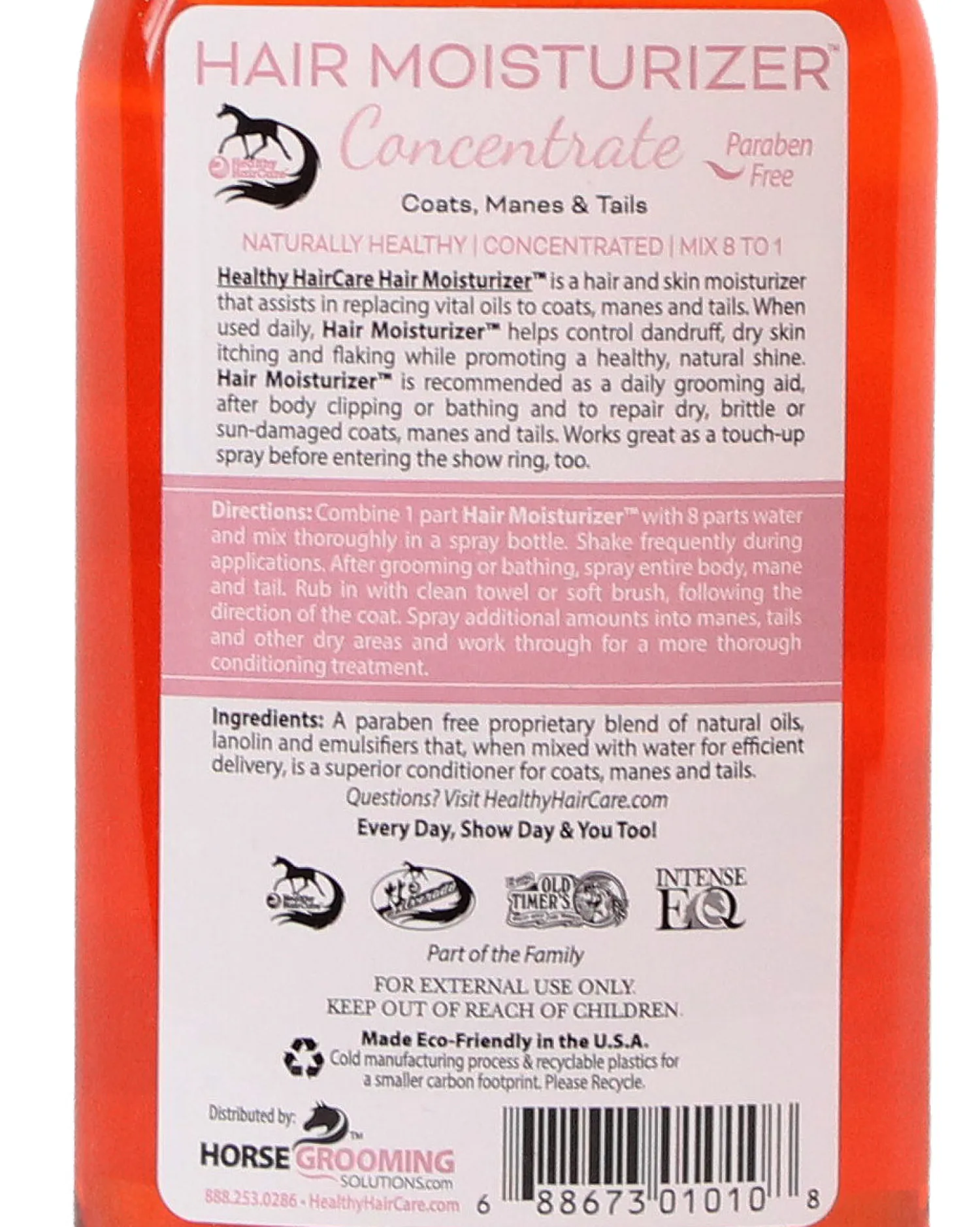The Healthy Haircare™ Hair Moisturizer Concentrate mixes with water into a therapeutic, lanolin enriched leave-in conditioner for horses. It assists in replacing vital oils to the horse′s hair and skin. Silicone and alcohol-free, this conditioner won′t irritate sensitive skin. Daily use of this product helps to control dandruff and dry skin, making it great for helping with blanket rubs, mane and tail itching. Pint.