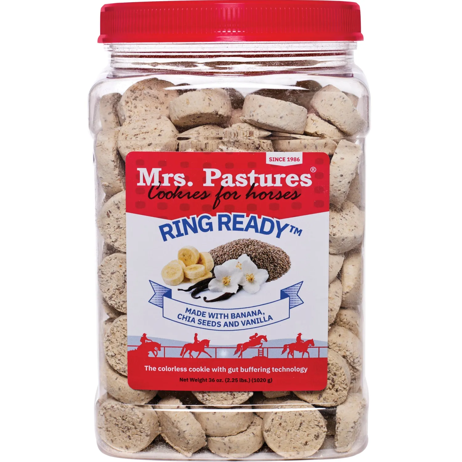 Mrs. Pastures Ring Ready Cookie has been nourishing the bond between humans and horses since 1986. Ring Ready is specifically designed to be fed before or during riding. Its colorless appearance keeps you and your horse looking “Ring Ready.” Designed with horses in mind, this cookie features gut-buffering technology to help horses cope with stress.