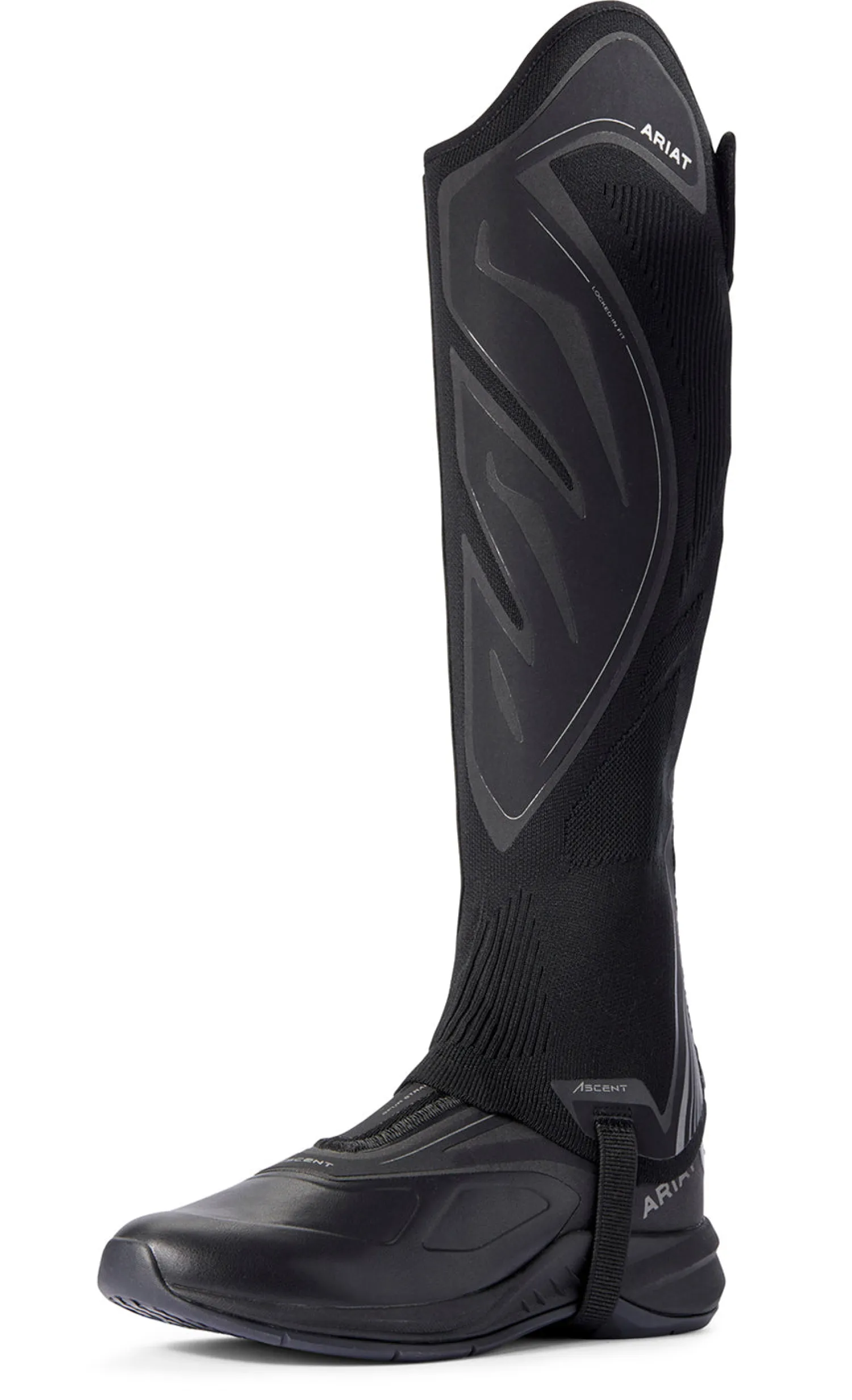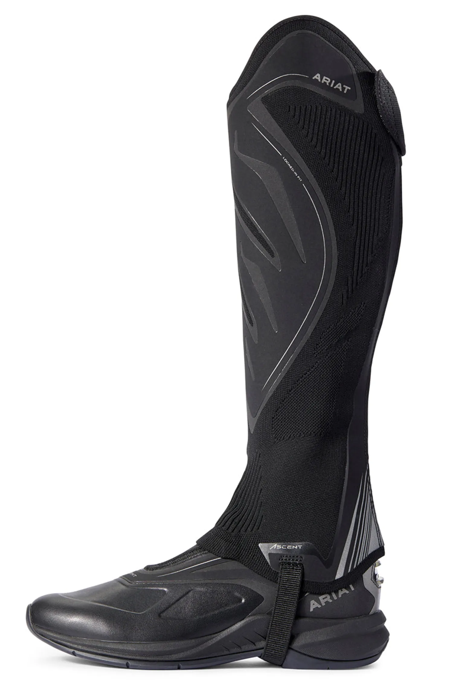 Offering a sock-like fit for close contact, this Ariat® Ascent Half Chap features unlined knit construction in synthetic material with mesh for breathability. No-sew overlay and inner calf reinforcement panel. Full-length YKK® back zipper with keeper. Flexible knit skirt over instep. Pair.