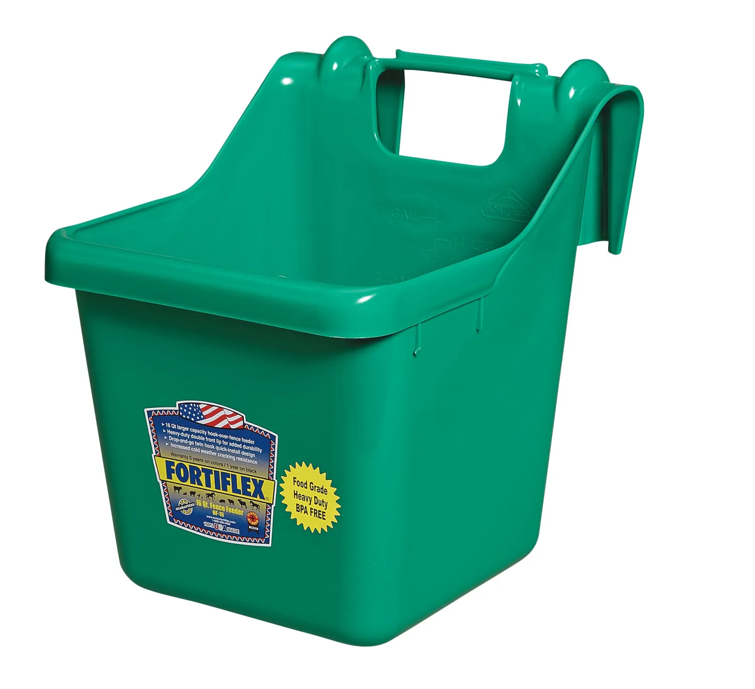 The Fortiflex® Hook Over Fence Feeder makes giving your pastured horse grain rations easy! Slip it over a fence rail and feed. Heavy-duty rear prongs hold it in place. No hardware is required, but top lip screw holes allow permanent installation. A reinforced front lip doubles as a grip. Made of Fortalloy rubber-polymer blend, it resists cracking. UV-protective additives ensure long life. Works well for feeding other farm animals, too. 16 quart capacity. Weighs approximately 3 pounds.