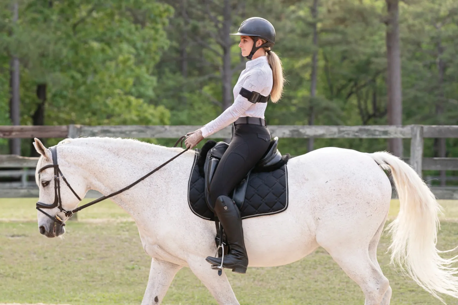 The Correct Connect™ Position Reminder helps you keep your shoulders back. This adjustable, elastic device takes the place of the old trick of carrying a crop behind your back. Wear it high on your arms to work on your shoulders and low on your arms to work on your elbows. It’s comfortable without being too restrictive or compressive.