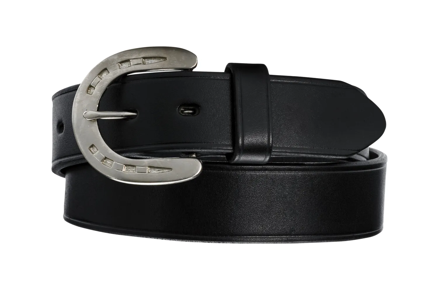 Invite extra luck and equestrian flair into your look! This Horseshoe Good Luck Belt is crafted from a strap of leather and fitted with a nickel buckle in the shape of a horseshoe. 1 1/4″ wide with seven adjustment holes.