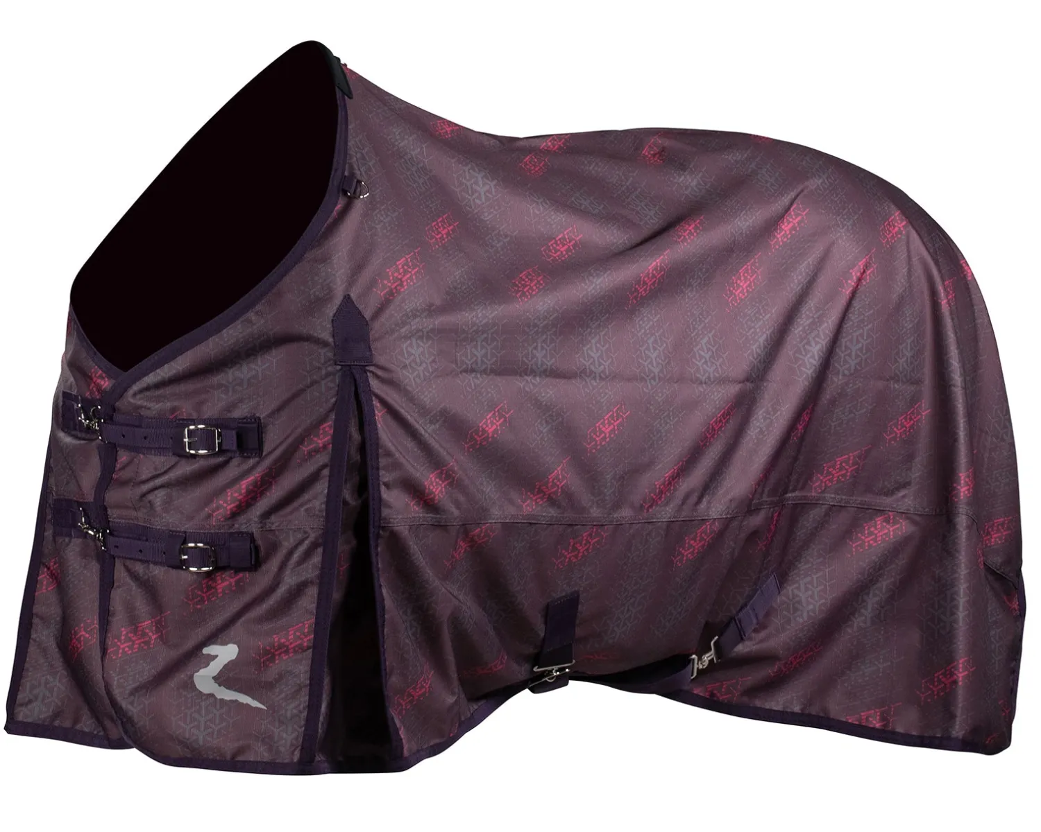The ergonomic design includes shaped neckline to reduce pressure and prevent rubbing on the withers. Adjustable double front buckle closures with quick-snap closings and double cross surcingles keep the blanket in place. A long tail flap and adjustable elastic leg straps prevent it from blowing if wind kicks up.