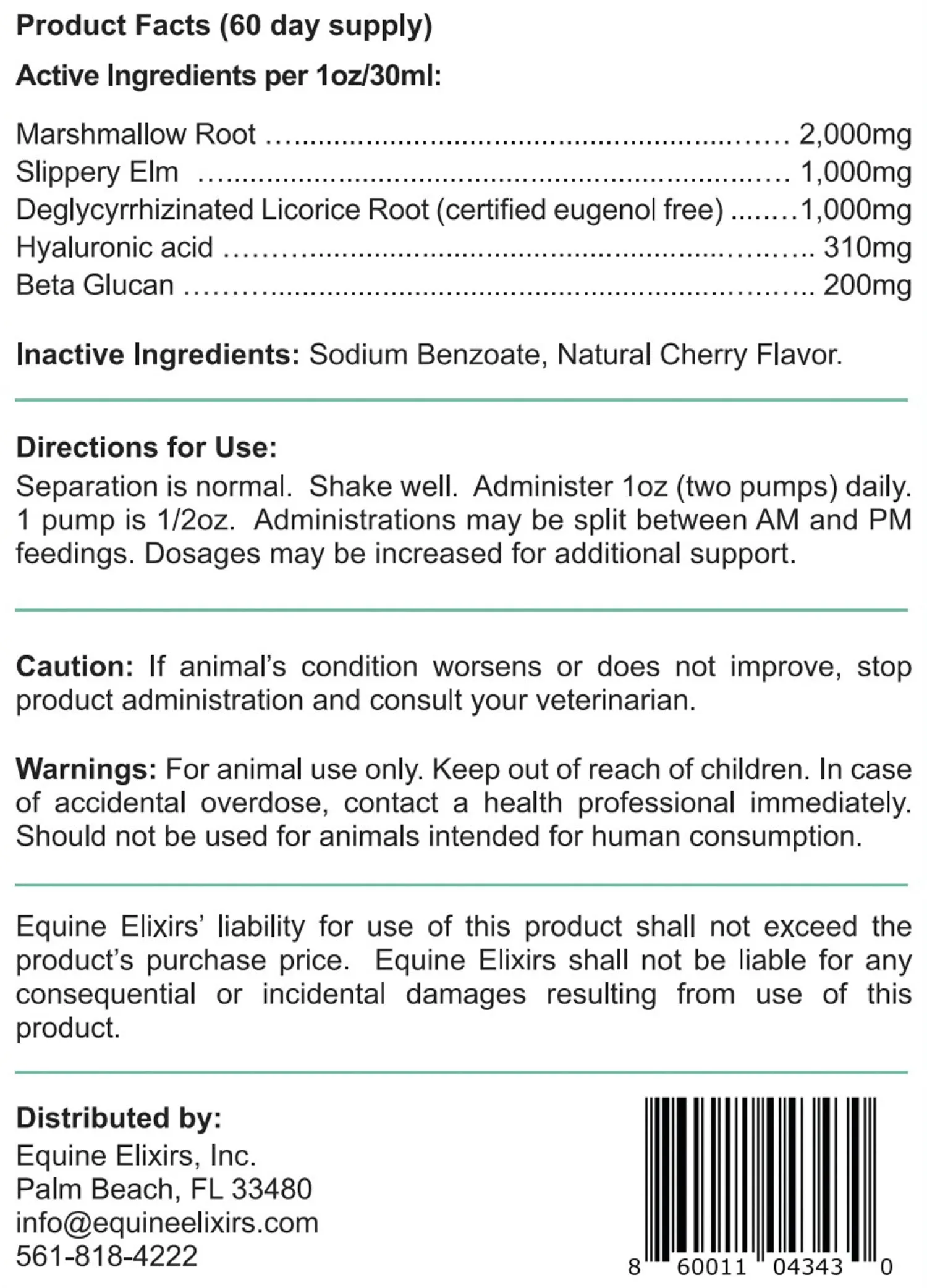 Equine Elixirs Slimer Liquid Gastric Support is bioavailable, research backed ingredients are shown to help preserve and protect gastric tissue throughout the squamous and glandular regions of the stomach. High molecular weight hyaluronic acid combined with beta glucan, a soluble fiber with a mucilage consistency, display gastroprotective properties that create a viscous slime coating throughout the stomach to help protect gastric mucosa. Marshmallow root, slippery elm and deglycyrrized licorice root also coat and protect the stomach, and provide mucosal-soothing and antioxidant effects reducing oxidative stress. Slimer can be fed daily by top dressing your horse’s feed or can be dosed via syringe prior to specific events such as competitions or travel. Serving size: Administer 1oz daily. For animal use only.