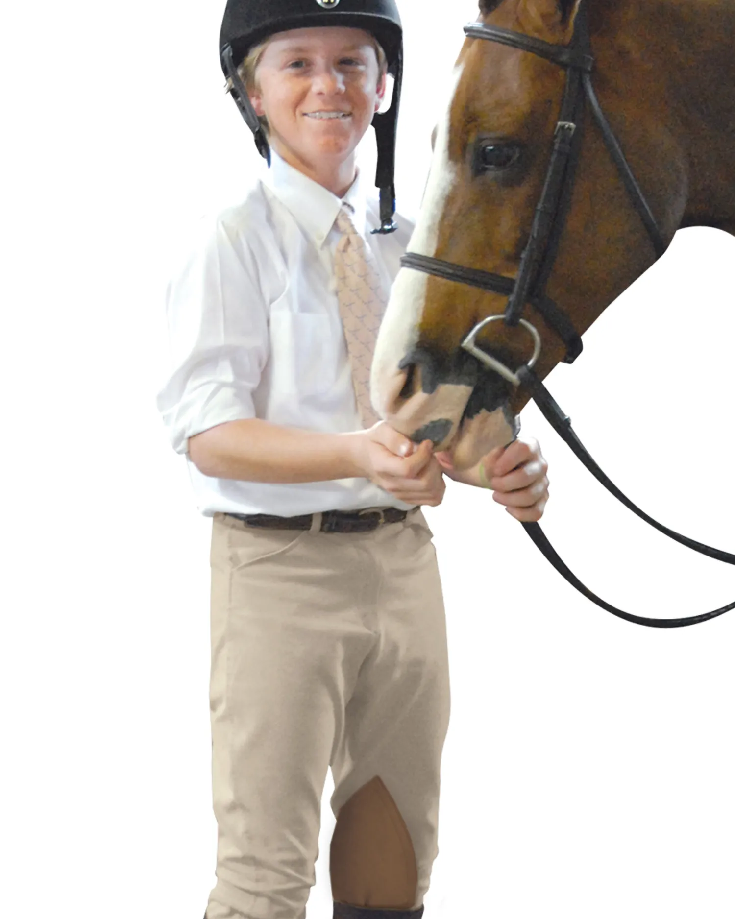 The Ovation® Boys’ EuroWEAVE™ Cuff Jod in memory stretch woven fabric isn’t clingy or revealing. This pull-on style mid-weight jodhpur has Syn-Tec™ Stretch Suede™ knee patches, cuff bottoms, removable elastic jod straps, belt loops, two front and two back pockets.