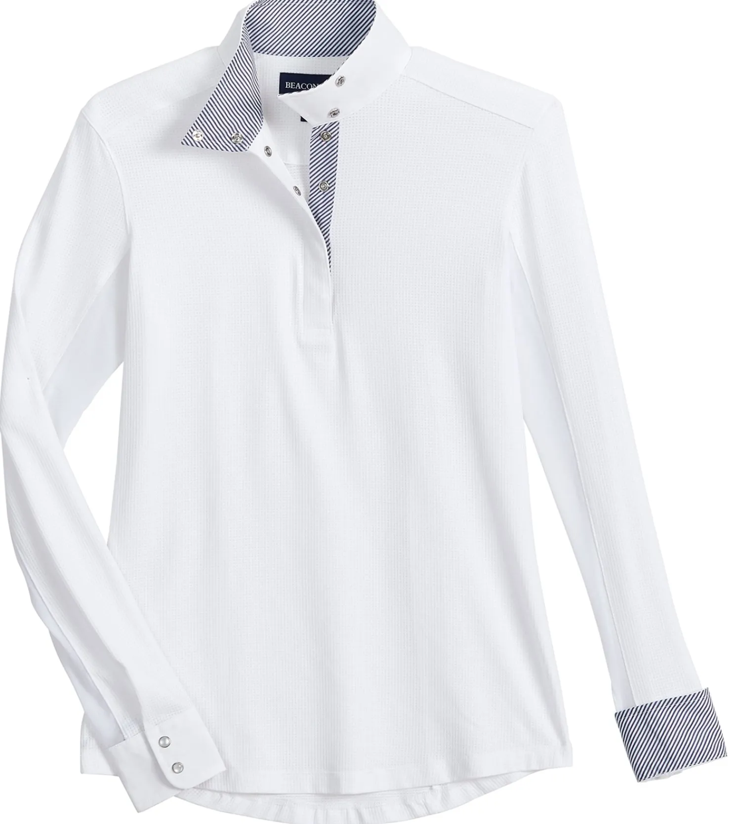 The Beacon Hill Long Sleeve Show Shirt delivers the show-ring polish, comfort and fit for which Essex Classics is known. Performance fabric wicks moisture and dries fast, making time between classes much more comfortable. It offers natural comfort stretch and UPF 50+ sun blocking, and it resists both stains and odors.