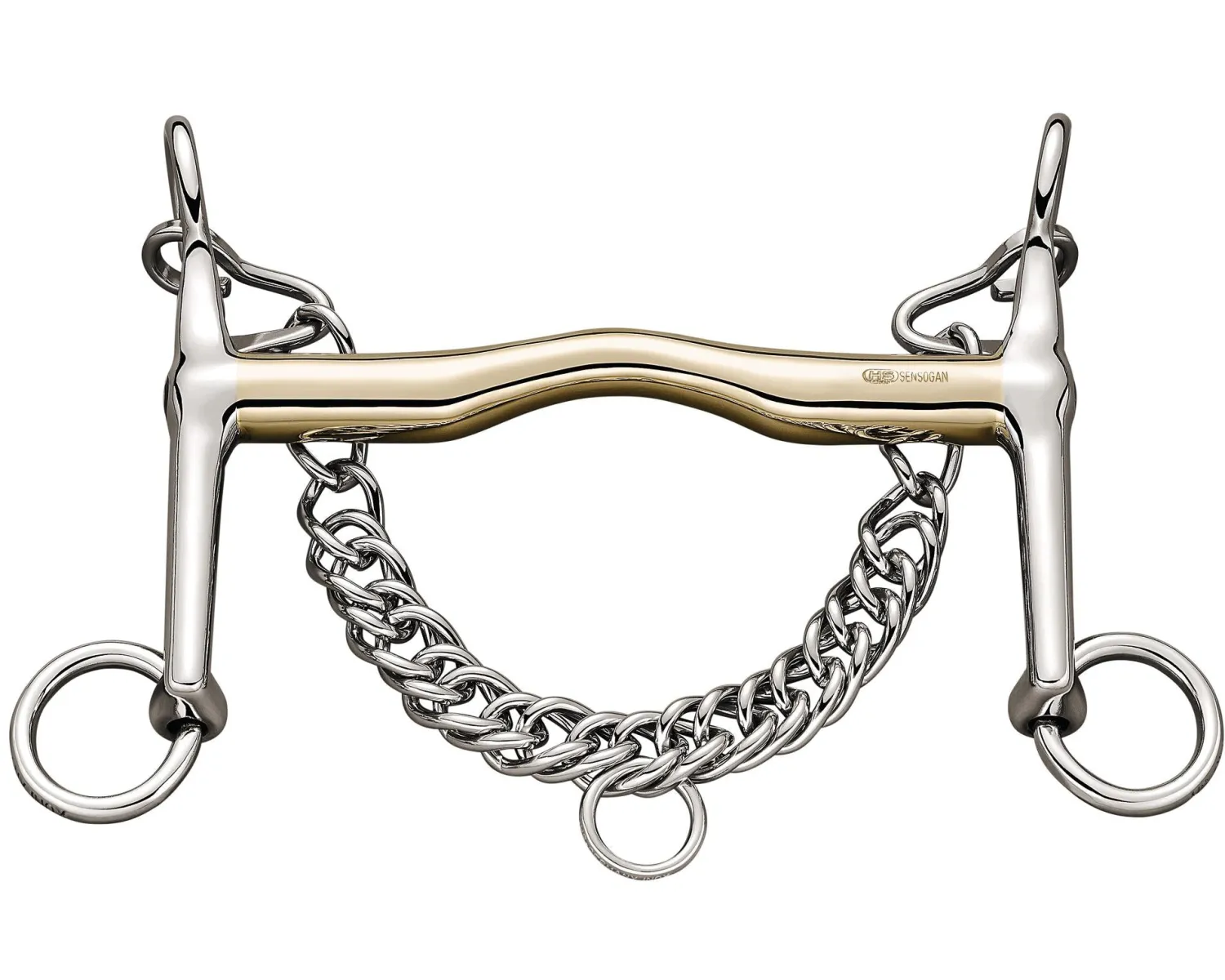 A good choice of curb bit for horses with a flat palatal arches, it features a Sensogan mouthpiece. A proprietary blend of copper, zinc and manganese, Sensogan has a pleasant taste that encourages salivation and bit acceptance. The leverage effect sets in more directly due to the short shanks.