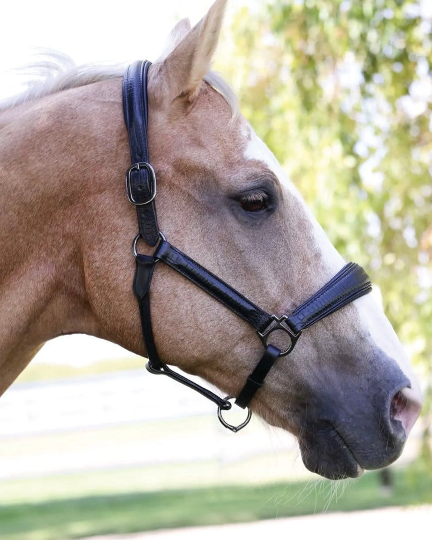 The Halter Ego® Doc Marten Padded Halter is perfect for the discerning equestrian in your life! Vegetable tanned Italian leather, embossed and treated to create the most gorgeous black Croc pattern. Padded noseband and padded crown provide superior comfort. Double buckle crown, snap throat release and conical noseband with 1″ wide cheekpieces.