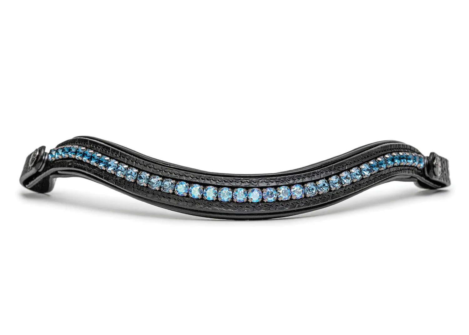 The ultimate in sophistication and innovation, The Halter Ego® Doc Marten Snaffle Bridle with a new invisible, removable flash. The black snaffle bridle is simply stunning and features elegant black crocodile printed leather on the anatomical noseband and browband. Plush black Nappa padding with black patent piping and a scintillating ombre crystal design adorn the browband. The anatomical crownpiece and buttery soft padding on the noseband provide ultimate comfort for your horse. Includes luxury rubber grip lined reins with hand stops. Full size reins are 56″ long x 1/2″ wide.