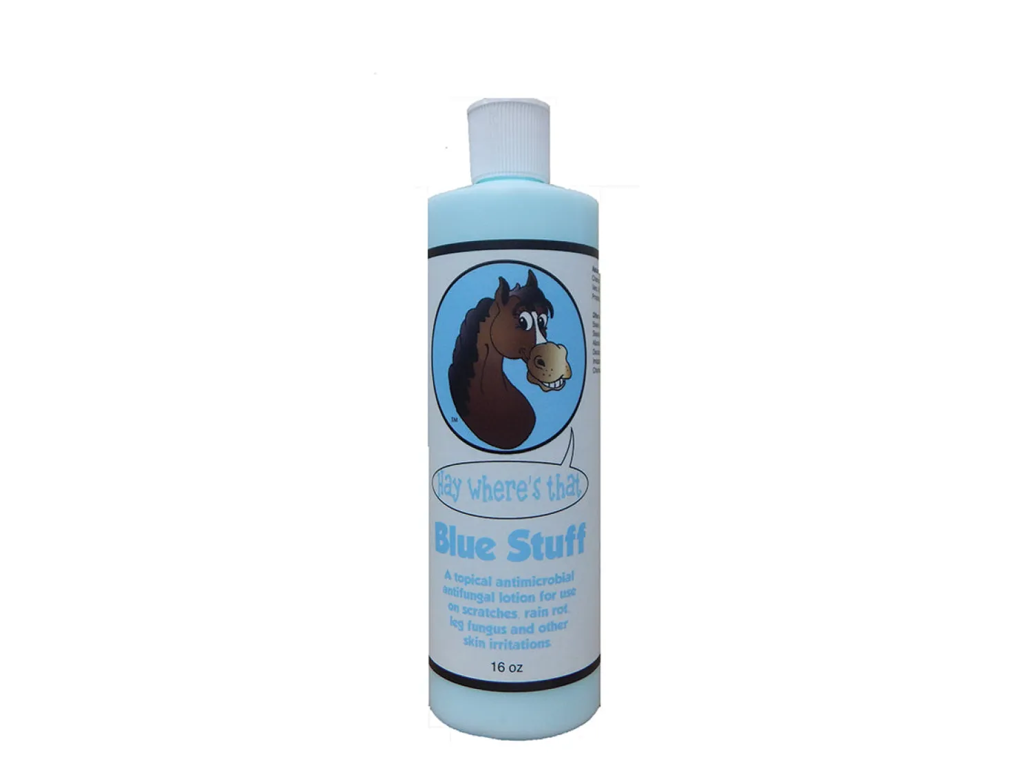 Hay Where’s That Blue Stuff works quickly on rain rot, scratches, sweet Itch and many other fungal or bacterial skin infections in horses. This topical, broad spectrum antimicrobial and antifungal lotion gets rid of that pesky fungus on the horses’ legs. It helps clear up chafing, saddle sores, burns and coronary band fungus and can be used on the horse’s face. Affordable, effective and non-sticky, a little bit goes a long way. It’s a must-have for your barn, with natural antiseptics and carrier oils helping to heal from the inside out with fast results. No rinsing or washing off required. That Blue Stuff lotion is already under the skin working to eliminate the infection. That Blue Stuff can be applied to a horse that has rain rot, and it can be turned out. If the horse rolls in dirt, mud or gets wet, it still works. As long as the horse is treated every day, That Blue Stuff will help eliminate the rain rot, scratches and a host of many other skin infections. 16 oz.