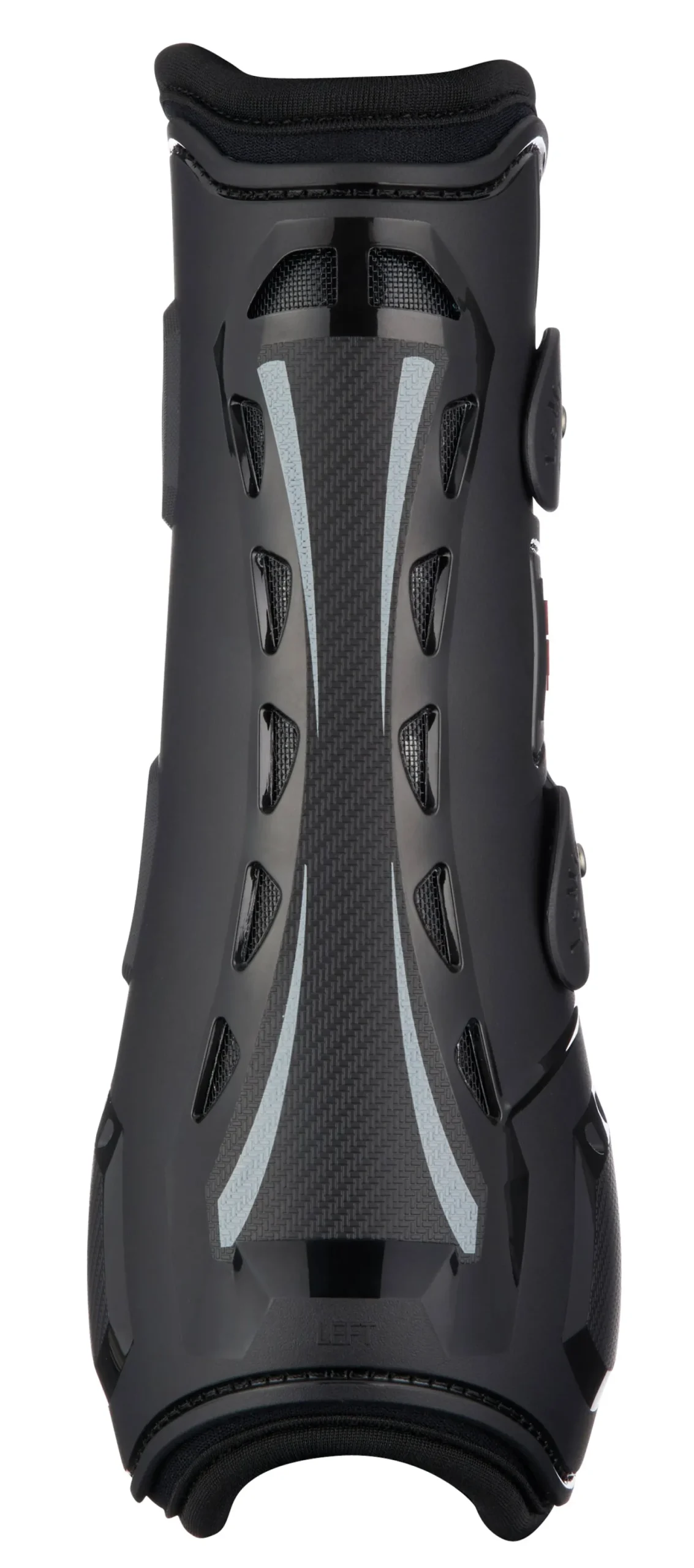 The lightweight shock-resistant shell is anatomically molded to protect and support the fetlock and tendon while fitting the leg perfectly for a secure fit. Rear and side vents release heat build-up as air enters lower vents, flows around tendons and rises to the upper extractor vent.