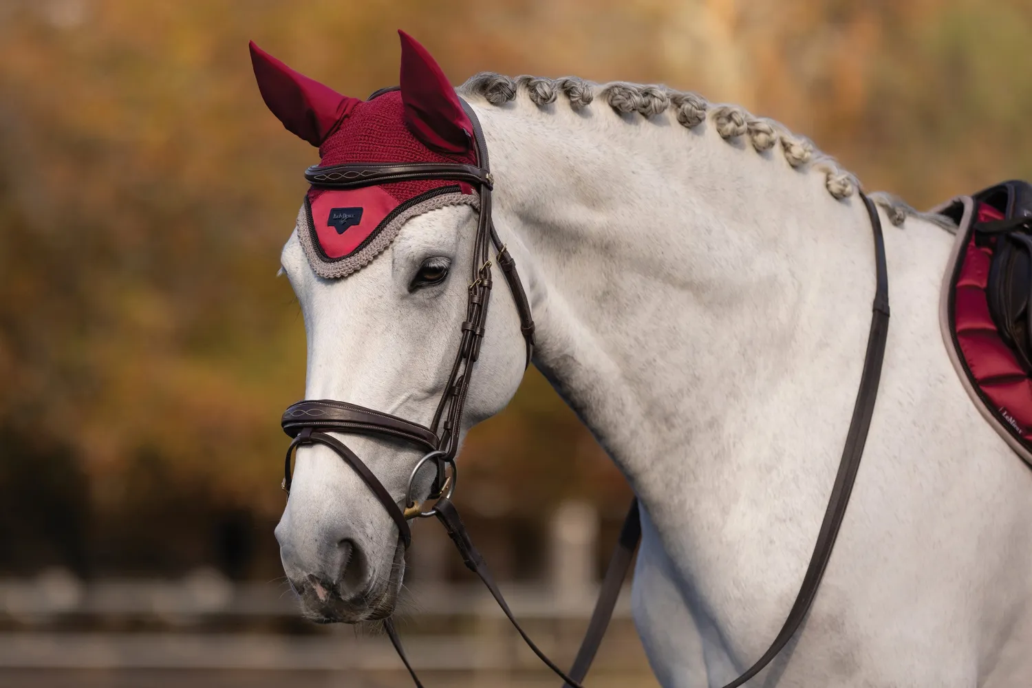Fashionable and functional, the LeMieux® Loire Fly Bonnet features a body that is crocheted by hand in an open knit for extra stretch and optimal breathability. Lightweight, breathable ear covers with four-way stretch protect against insects and dust. Trimmed with cording, a Loire satin patch and LeMieux badge, this fly hood offers a neat and secure fit under a bridle.