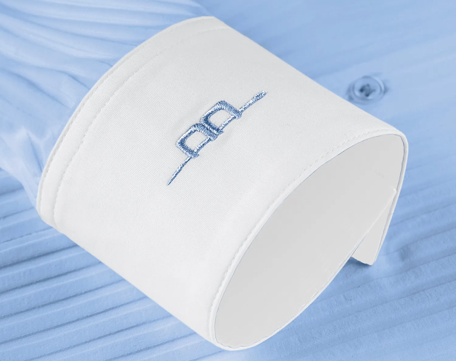 Alessandro Albanese’s best-selling competition shirt, the Aurora Shirt incorporates advanced fabric technology to help athletes perform at their peak. The lightweight, breathable microfiber fabric is woven in a wide ribbed pattern that offers incredible stretch and a pretty, slimming drape that flatters the figure. It has antibacterial properties to resist odor, and is easy-care, quick-drying and wrinkle-resistant. Properties are built in to reflect the sun and keep body temperature down, while long sleeves provide protection from the UV rays. Fitted to lie smoothly under you show coat, this riding shirt is has two chest pockets for added style and a stand-up cotton twill collar and cuffs for a traditional look. Collar has a magnetic closure. The blue shirt has white collar, cuffs and pocket detail; white shirt is solid.