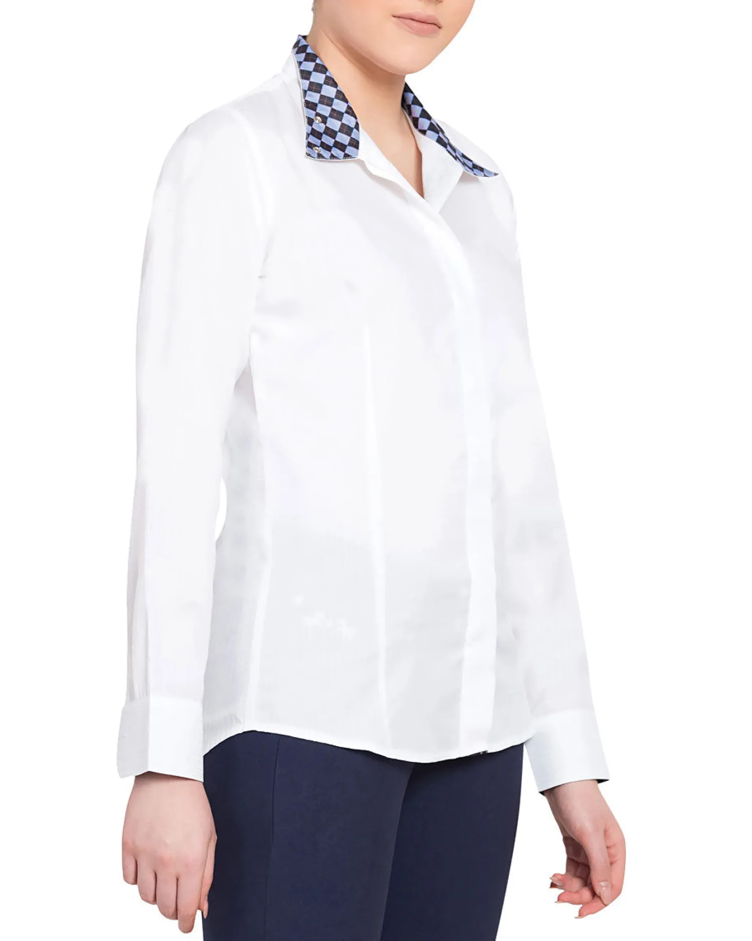 The Equine Couture™ Ladies’ Isabel Coolmax® Long Sleeve Show Shirt is designed to help keep you cool under a show coat. Moisture-wicking properties makes it ideal for spring and summer competitions. Colorful, contrasting designs line the inside of the collar, under the buttons and inside of the cuffs to add some personality to your show outfit. The easy, convenient snap collar provides a traditional look when closed for the show ring, but offers a fun flair when worn open.