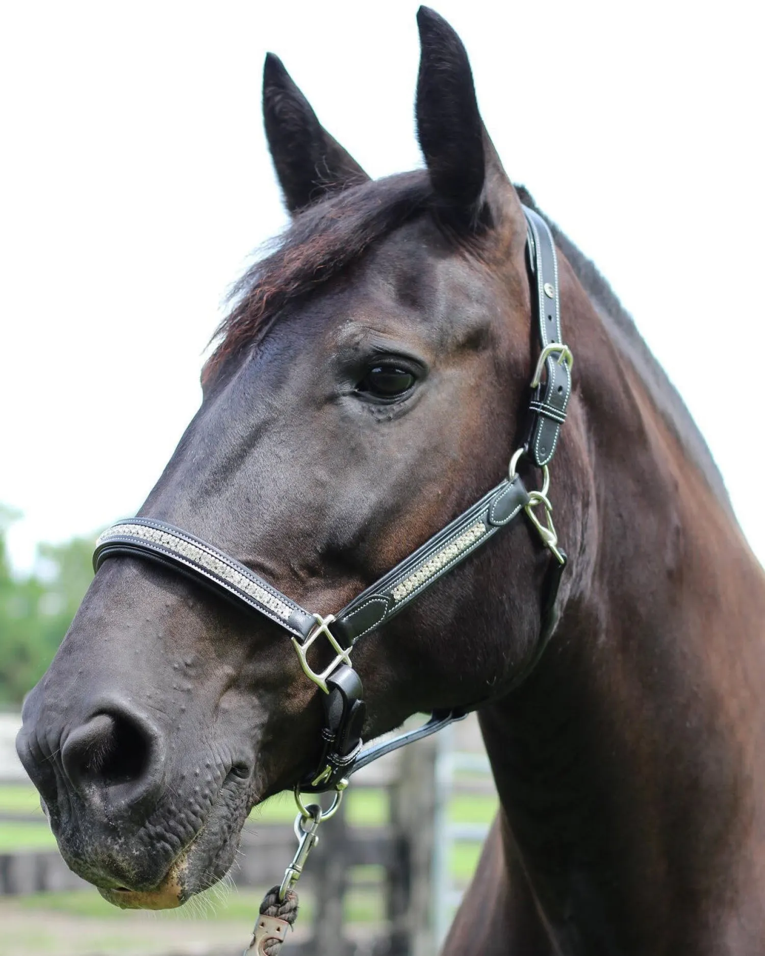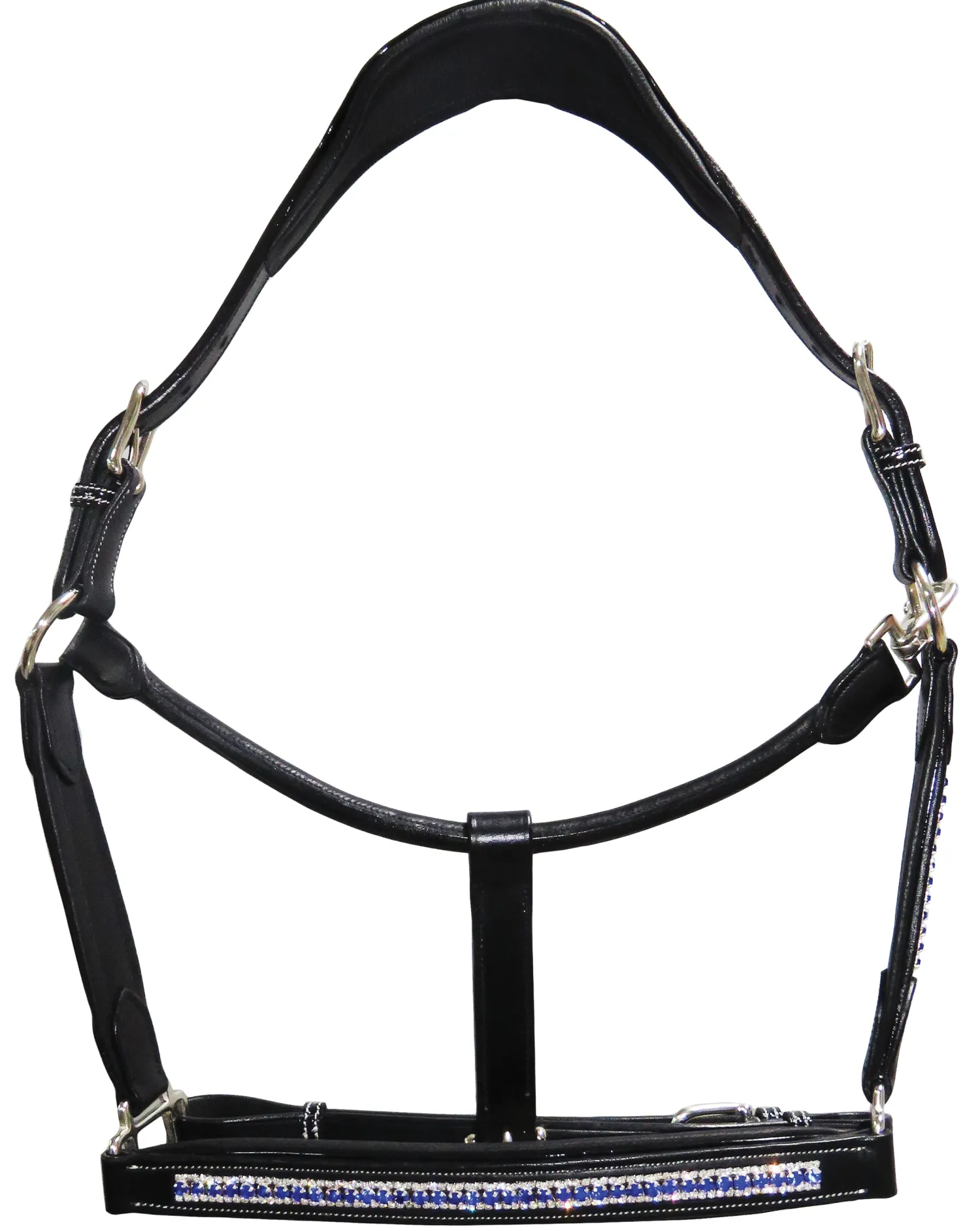 The Padded Jewel Halter by Henri de Rivel shows off your sense of fashionable style. Made of soft, high-quality leather, this eye-catching halter features three rows of crystals on the nose and cheeks accented by patent leather piping. Luxuriously padded for horse comfort, it has a two-buckle crown, adjustable chin and rolled throat with snap closure. Fitted with long-wearing stainless steel hardware throughout.
