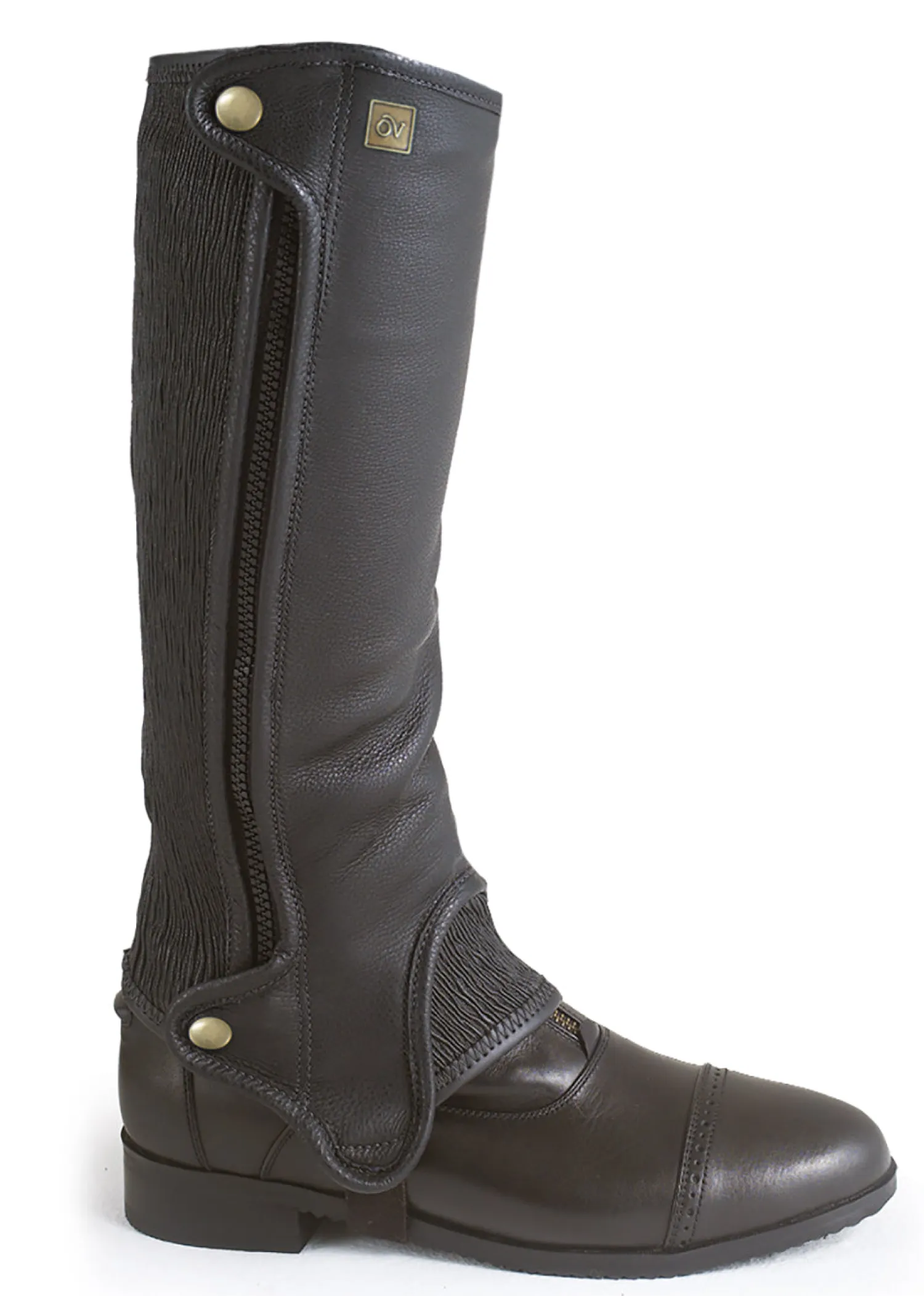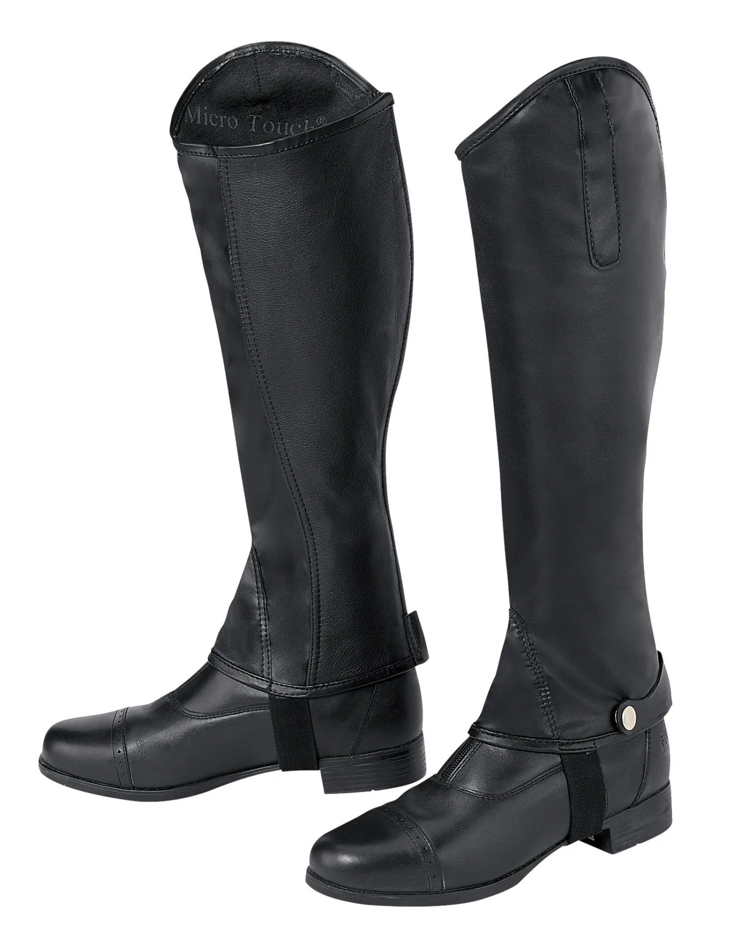 Fashioned with the elegance of a tall boot in mind, the TuffRider® Ladies’ Micro Touch Half Chap features Micro Touch stretch synthetic leather for comfort and easy care. This sleek half chap has a discreet back zipper that closes from top to bottom and virtually disappears when you’re in the saddle. A high-cut topline lends a sophisticated look, while grippy leather on the inner leg adds extra durability. It’s finished with a wide zipper keeper with snap, sewn-down swagger tab and inset over the instep.