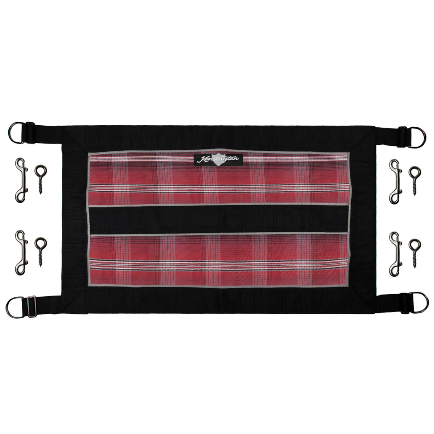 Kensington’s Stall Guard adds a touch of elegance to your stall door opening while it keeps your horse safely in the stall. Made of durable Textilene® mesh and bordered on all four sides with 3″ nylon webbing, the guard is adjustable to fit openings up to 47″ wide using the adjustment straps. Beautiful brass hardware completes the look and includes heavy-duty D-rings for easy fastening, double ended snaps and screw eyes for attaching to the barn door. The solid web center is ideal for personalization with a monogram.