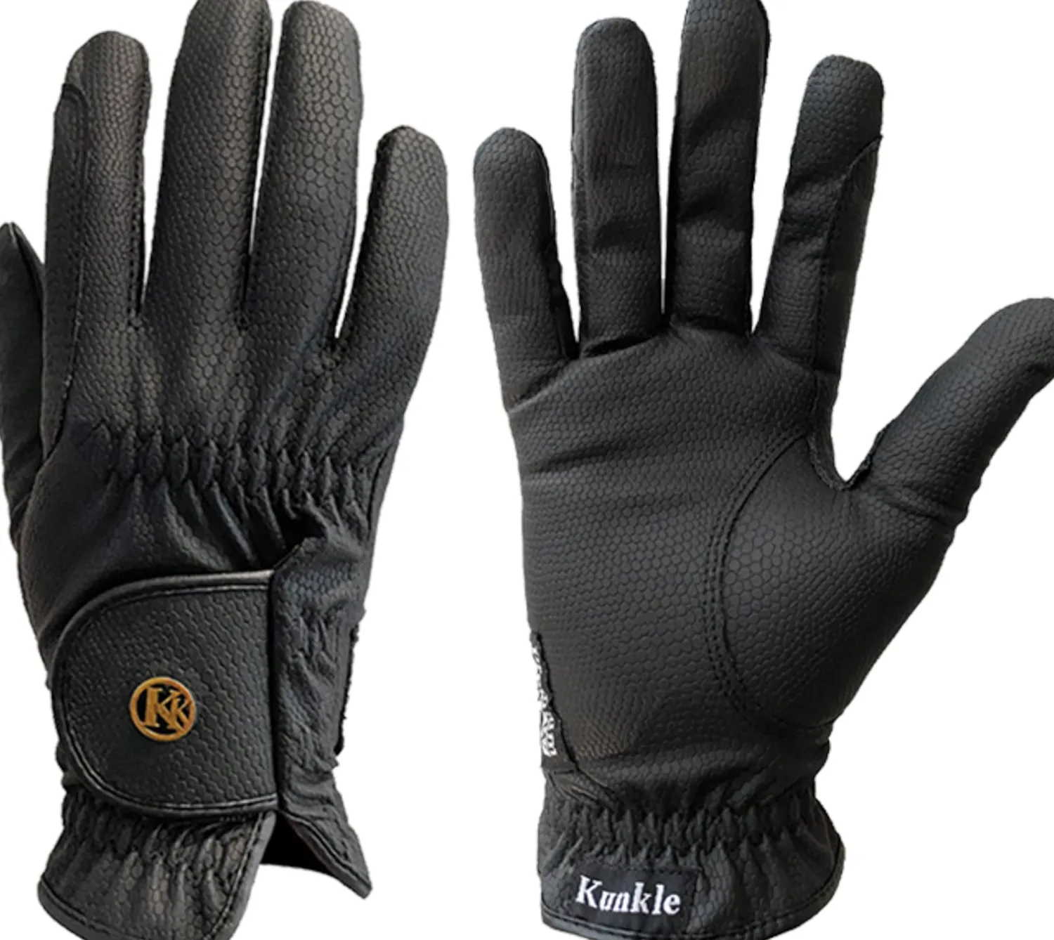 Kunkle Show Gloves last 2X longer than the average glove. Synthetic leather with a textural, pebbled finish stands up to use while providing a second-skin feel and a slip-free, tacky grip. Only .5mm thick, the gloves offer superior tactility, dry completely overnight and work with touchscreens. Areas of rein contact are reinforced.