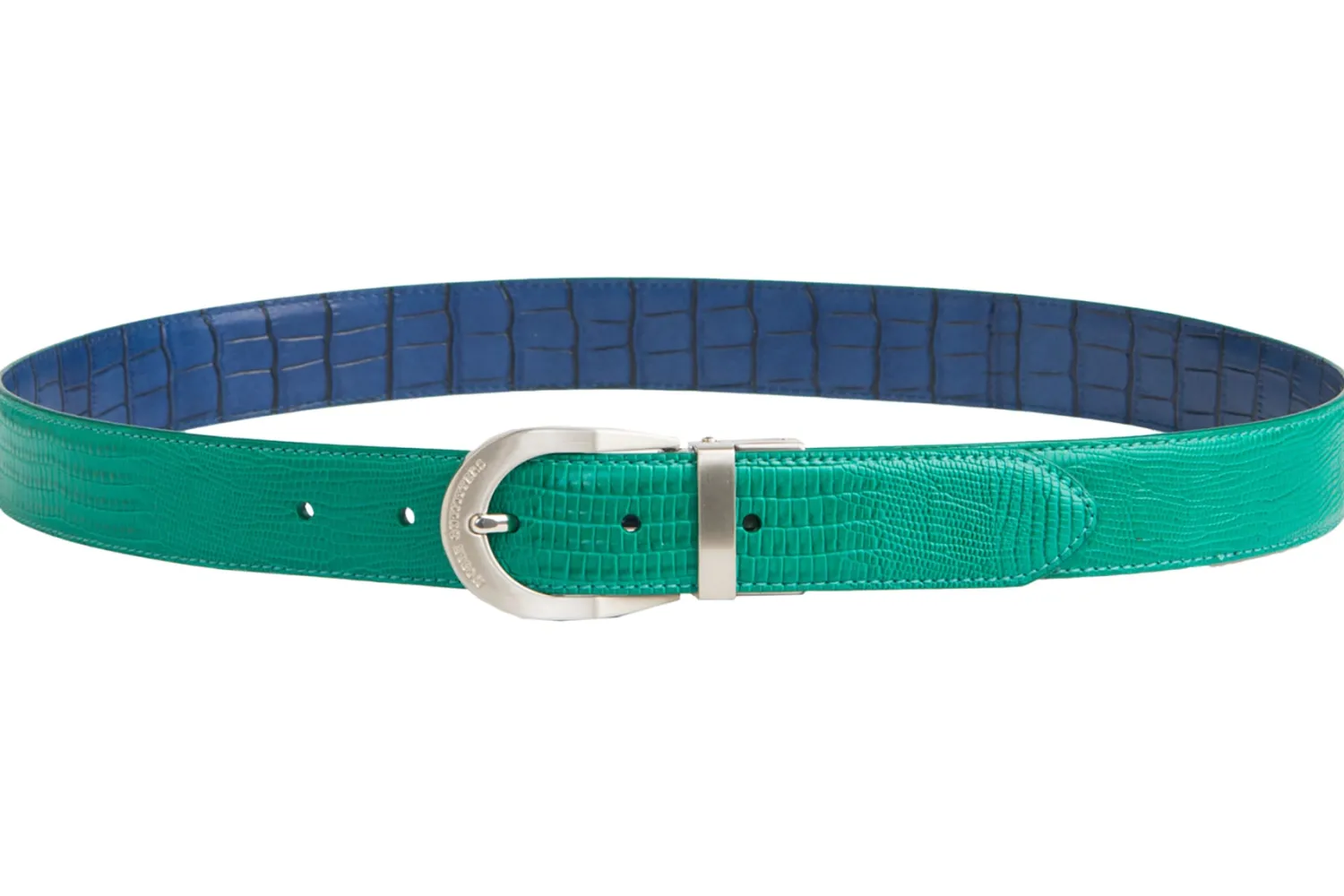 This Noble Outfitters™ Back-to-Back Reversible Belt is two looks in one! It’s the perfect accessory for any outfit regardless of hue. Made of quality, full-grain leather, it reverses from a lizard print to a crocodile print. Reversible buckle with logo detailing.