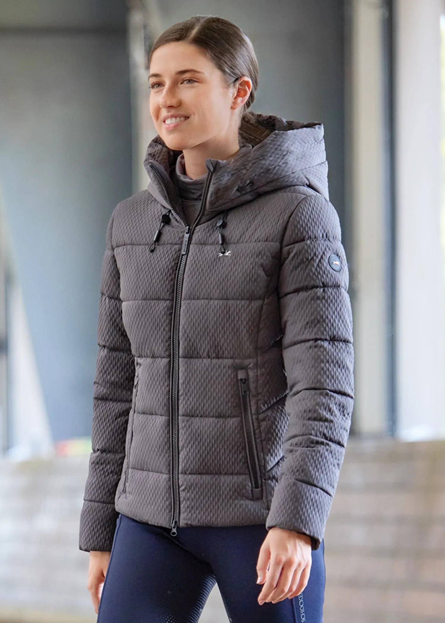 Schockemöhle SpFelica Jacket combines sophisticated design and functionality. Fashionable, structured women´s quilted jacket with Dupont filling. Tonal piping, 2-way front zip and a lockable hood with wide adjustable placket and press buttons. Logo print on back, chest and left sleeve.