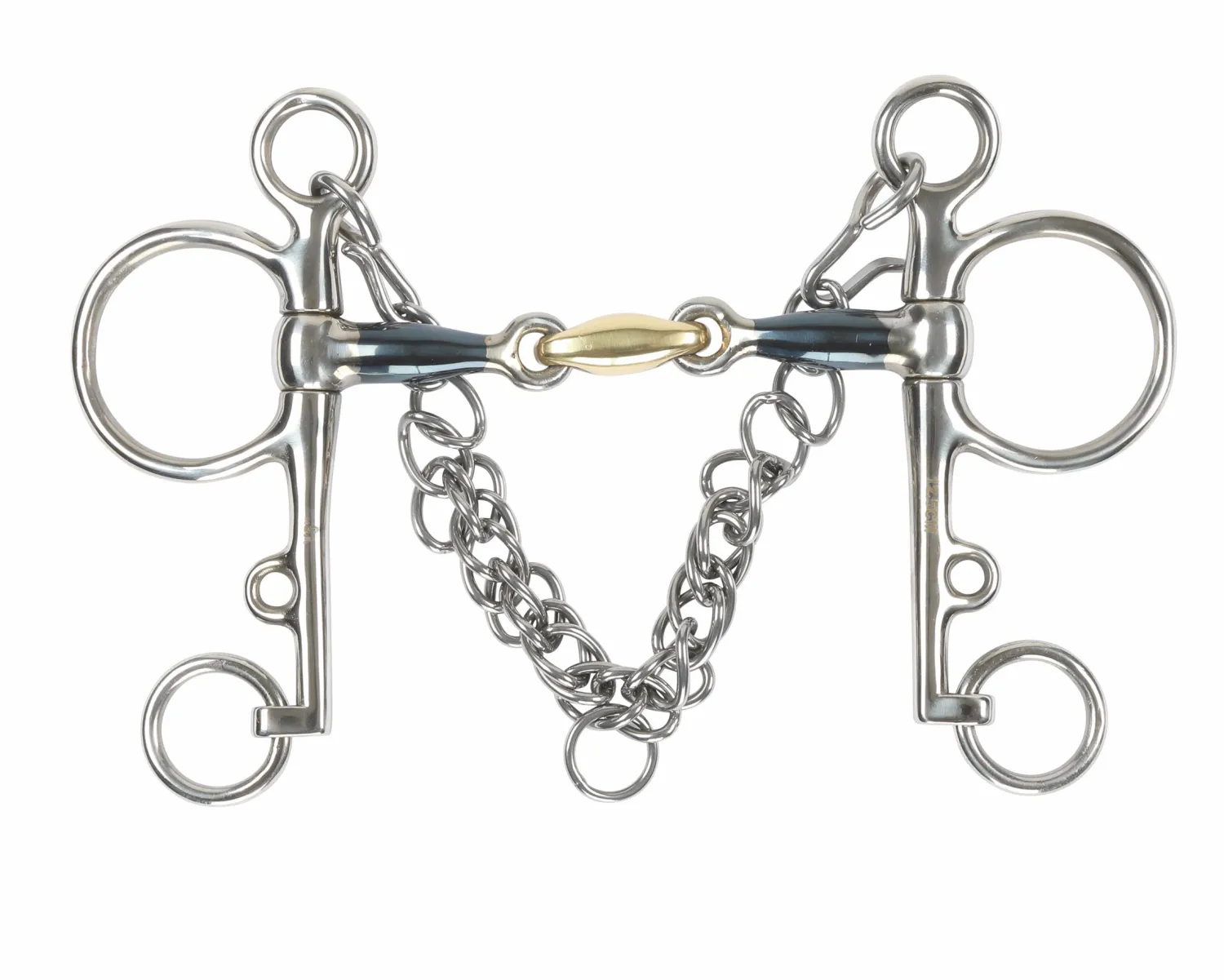 It can be used with double reins or Pelham roundings. Mouthpiece is 14mm. Rings are 125mm (in bit size 4.5″), 130mm (in bit size 5″) and 140mm (in bit sizes 5.5″, 6″).