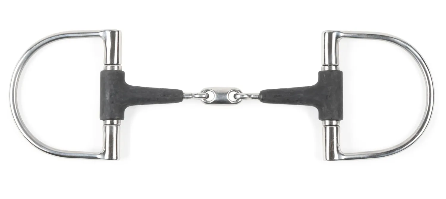 The Equikind+ Hunter Dee Bit with Lozenge has a 13mm three-piece mouthpiece with a thin rubber coating. The rubber makes it milder than a traditional metal bit as it softer on the horse’s bars and lips. The lozenge lies nicely on the tongue and offers mild tongue pressure. D-rings are a classic design that can assist with sideways stability in the mouth. Rings are 90mm.