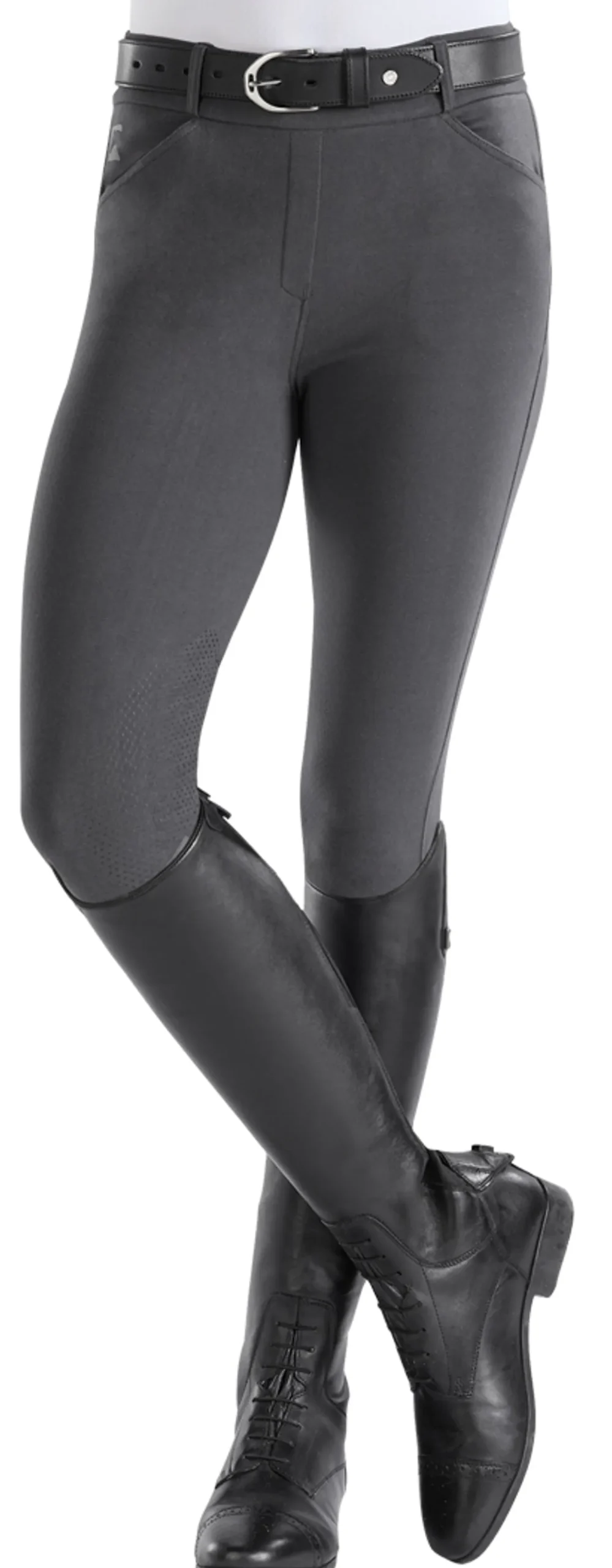 The pull-on waistband is comfortable and flattering, while the faux-fly front and belt loops offer the appearance of a classic breech. Elastic taped cuffs prevent the breech legs from riding up.