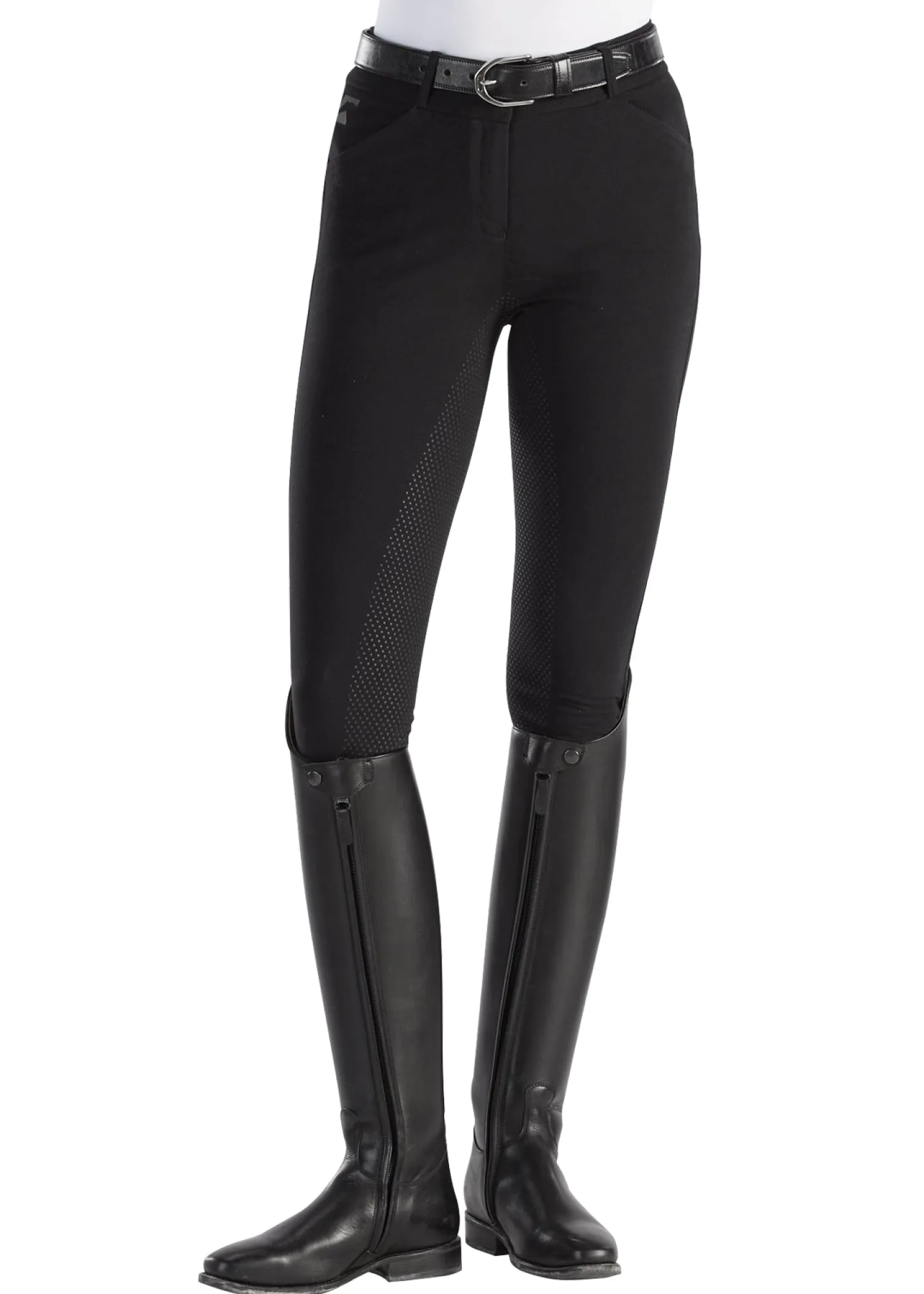 The Riding Sport Schooling Full-Seat Breech has all the wonderful qualities of cotton in a traditional breech. Soft, breathable and wicking with stretch to boost your freedom of movement. Mid-weight with a mid-rise waist and belt loops. Two front slash pockets and a silicone dot pattern for extra grip. Easy care fabric.
