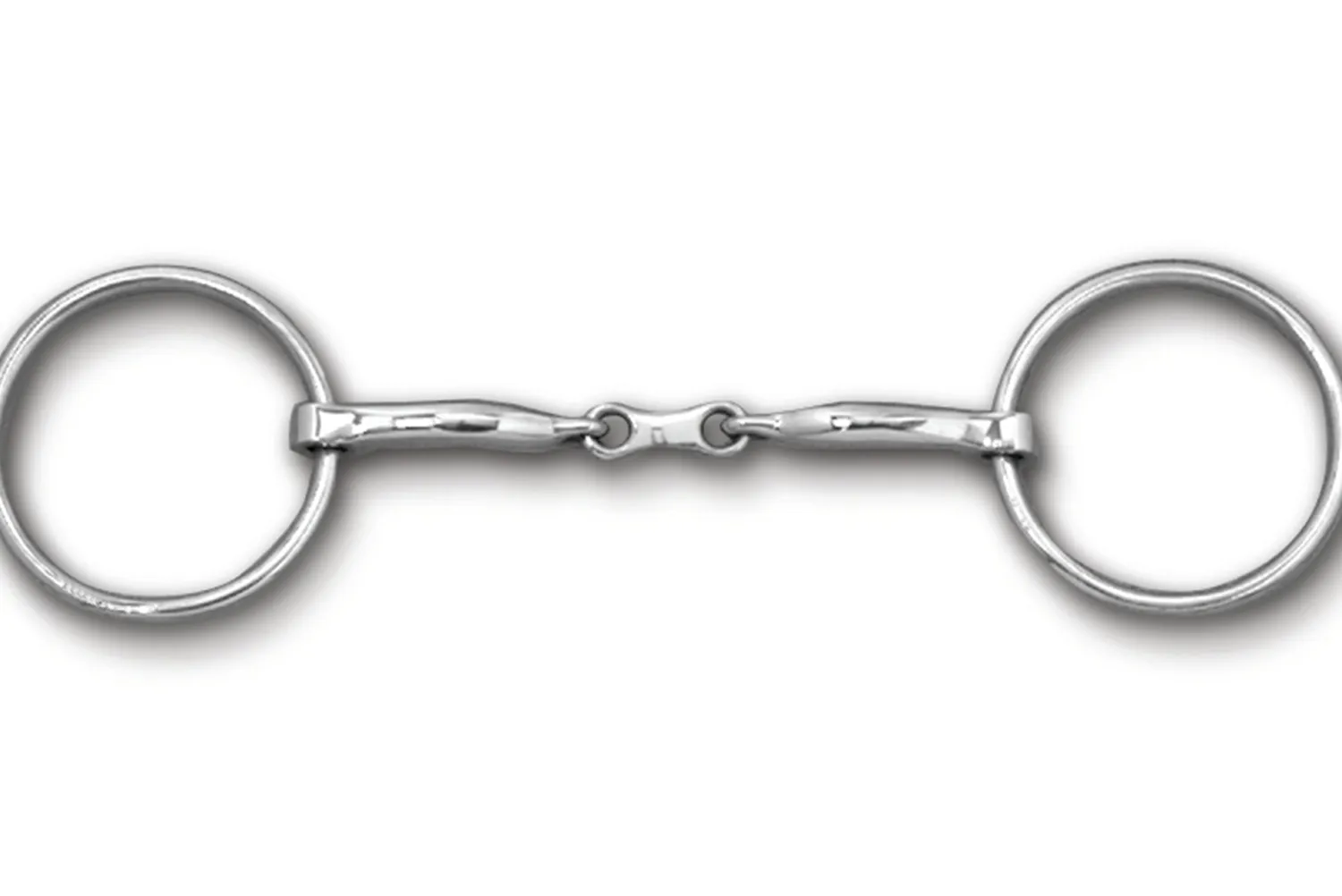 The curved mouthpiece permits the horse to swallow more freely and distributes pressure more evenly compared to traditional snaffles. Stainless steel with copper inlay.