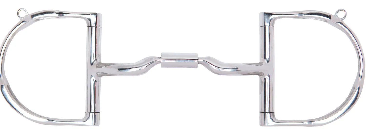 The dee with hooks is a stainless steel D-shaped ring with fixed attachment of the mouthpiece and slots (hooks) at the top and bottom of the rings for bridle and rein attachment. The small loop behind the top slot accommodates a curb strap (attached with two curb hooks). Both the top bridle slot and bottom rein slot on the standard and medium dee will fit standard 5/8″ bridle leather. The slots on the pony dee will fit 3/4″ bridle leather.
