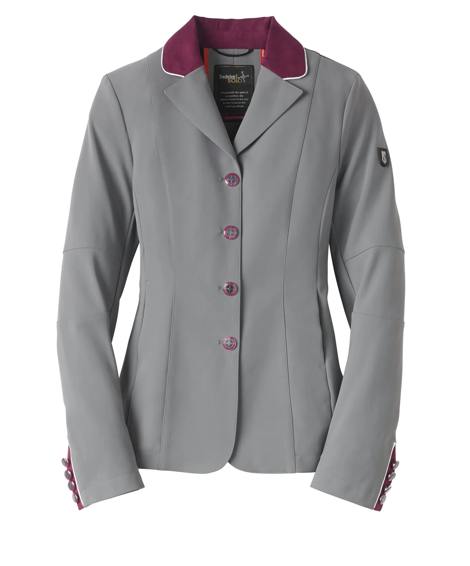 The Tredstep™ Solo Vision Coat is tailored in exclusive high performance I-Cool fabric. It’s lightweight, with silent motion and 360 degree stretch. This easy-care show jacket is at the top of its class, incorporating mesh under the articulated sleeves, a hidden front zipper under contrast snap buttons and matching contrast collars and cuff details. These elements combine grace and beauty with athletic functionally for the ultimate comfort. Left unlined to maintain the light feel. Extended sizes available.