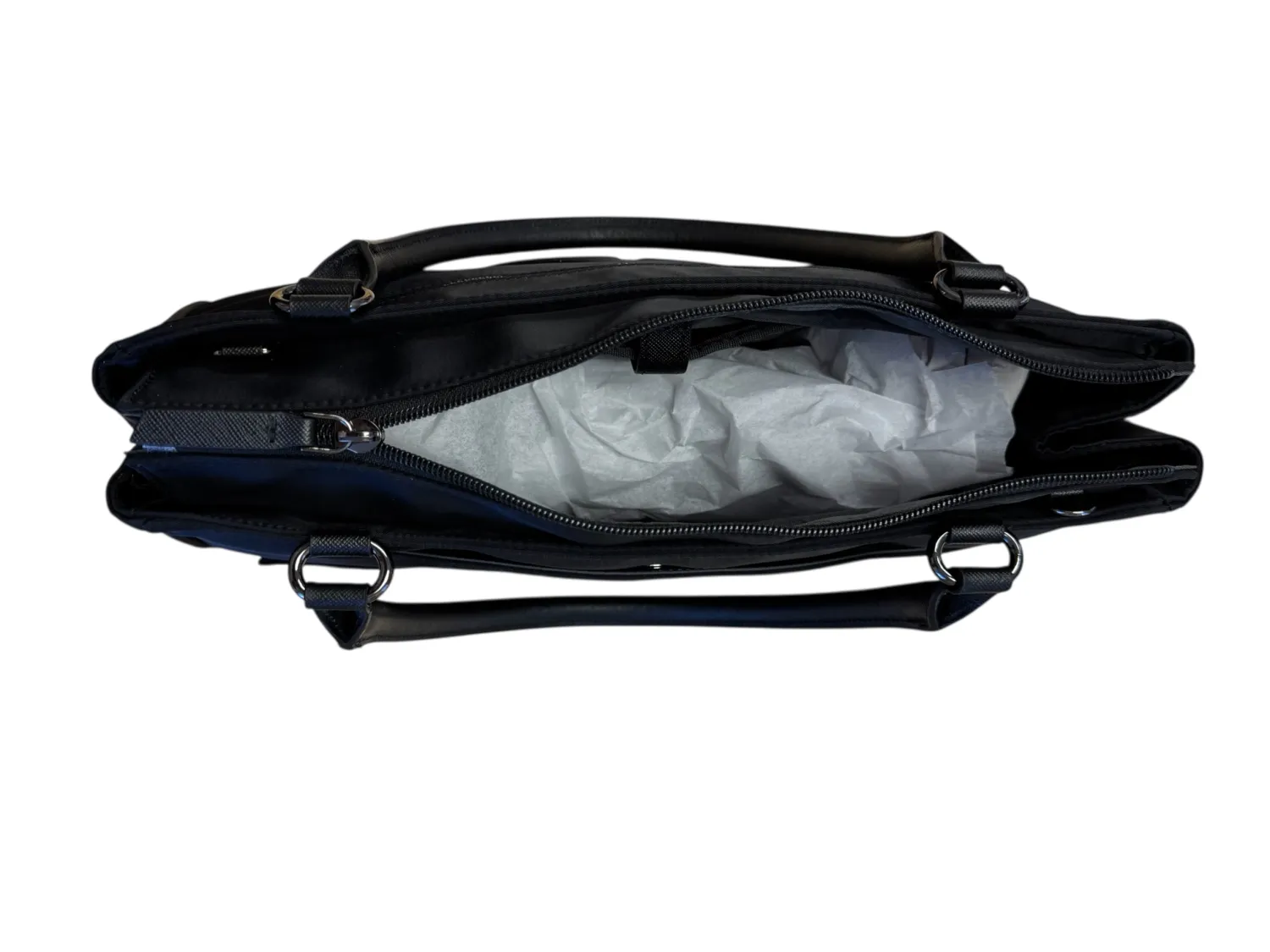 Carry your equestrian style to your work spaces and beyond with the Tucker Tweed Equestrian™ Medium Office Tote. This nylon/leather upscale tote is a pocket powerhouse! Interior pockets for laptop, drink, phone, cords and more. Exterior completed with gunmetal hardware, matching zipper pockets both front/back and trolley sleeve. Includes adjustable shoulder strap. Fits 13″ PC/14″ MacBook laptop.