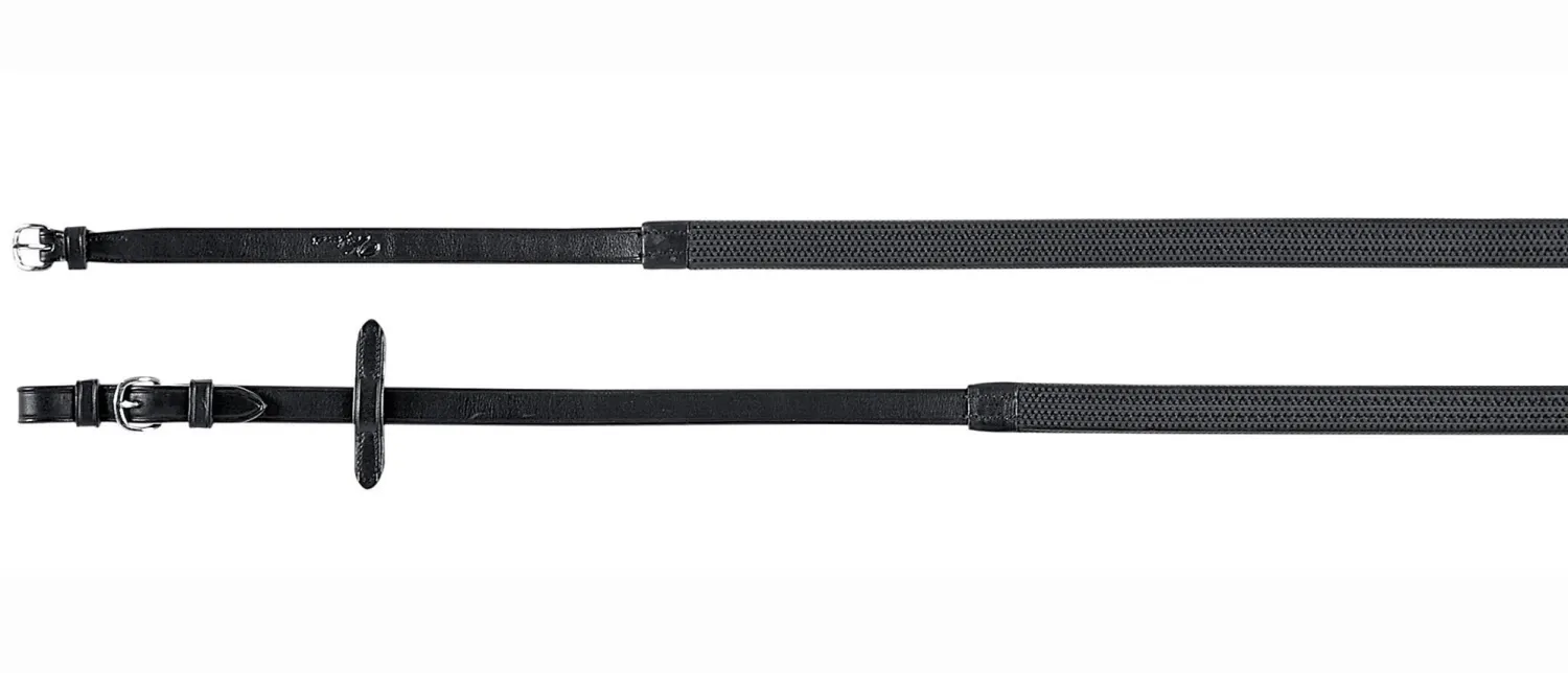 Vespucci Rubber Reins with martingale stops and buckle ends. Rubber ensures a no-slip grip while leather ends offer durability and style. 3/4″W x 54″L.