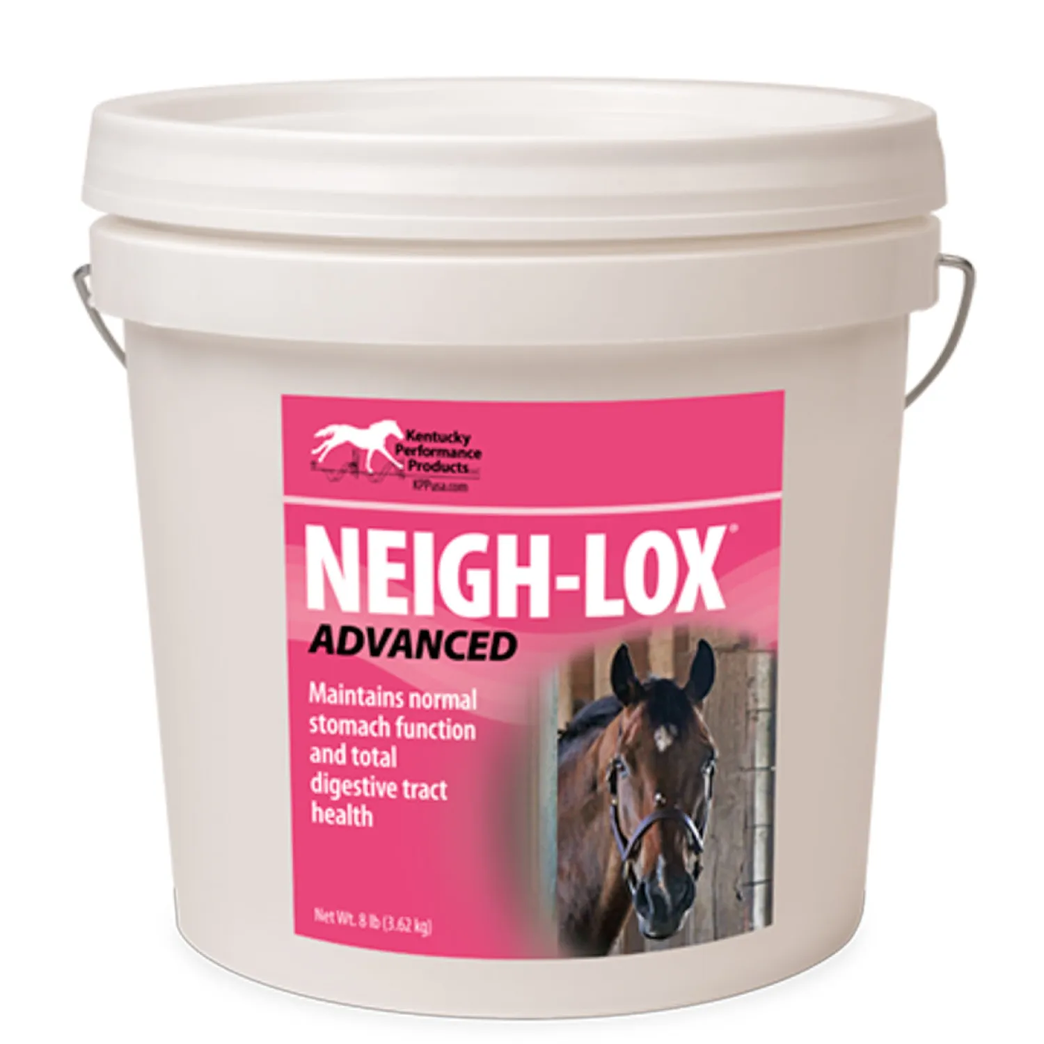 Neigh-Lox® Advanced from Kentucky Performance Products has a blend of ingredients that work to maintain normal digestive functioning in all classes of horses. In a palatable pellet form, this supplement can be fed alone or mixed with feed. It supports proper pH levels throughout the digestive tract to maintain a favorable environment for beneficial bacteria and supports the healing of irritated tissues. Active ingredients: aluminum phosphate, dihydroxy-aluminum sodium carbonate, saccharomyces boulardii and dried yeast fermentation product. Inactive ingredients: calcium carbonate, dicalcium phosphate, ground oat groats, ground wheat, lecithin and soybean oil. 8 lbs provides a 16-day supply when 8 oz are administered daily. 2 oz scoop included. Divide portions equally throughout a 24-hour period and feed at a rate of: Young, growing horses (6-12 months of age): 2-3 scoops daily. Yearlings (12-24 months of age): 4-6 scoops daily. Horses in training: 4-6 scoops daily.