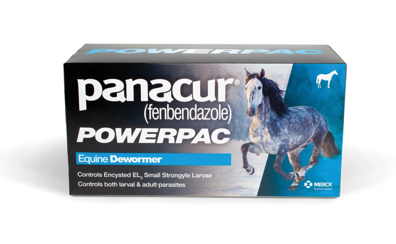 Highly effective Panacur® PowerPac equine dewormer by Merck Animal Health (5 x 57 gram syringes) offers a complete treatment course against the predominant internal parasites in horses. Each syringe is a double dose of fenbendazole for a 1,250 lb horse. It contains a unique apple cinnamon flavor. Panacur PowerPac is designed to be given for five consecutive days to a individual horse. 5 syringes, 57 grams each.