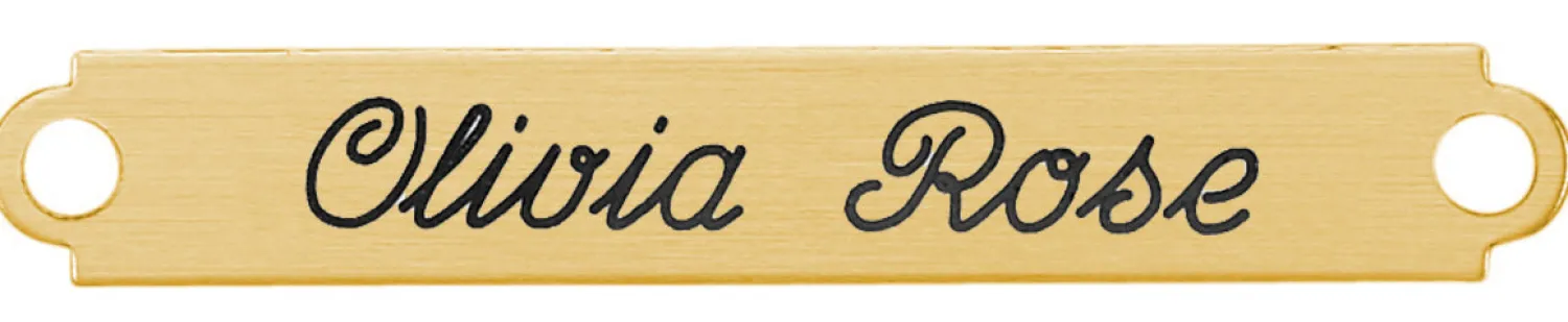 Our Fancy Martingale Nameplate is an attractive way to identify your horse’s martingale or breastplate. The nameplate will be engraved in the USA in your choice Block, Old English, Roman or Script letters with your horse’s name or your name. Predrilled 5/32″ holes fit rivets for attachment. Two sizes of rivets are included to allow you to attach the nameplate to either a padded or flat leather. Choose Brass or German Silver. Usually ships in 2-4 business days. Personalized items are not returnable.