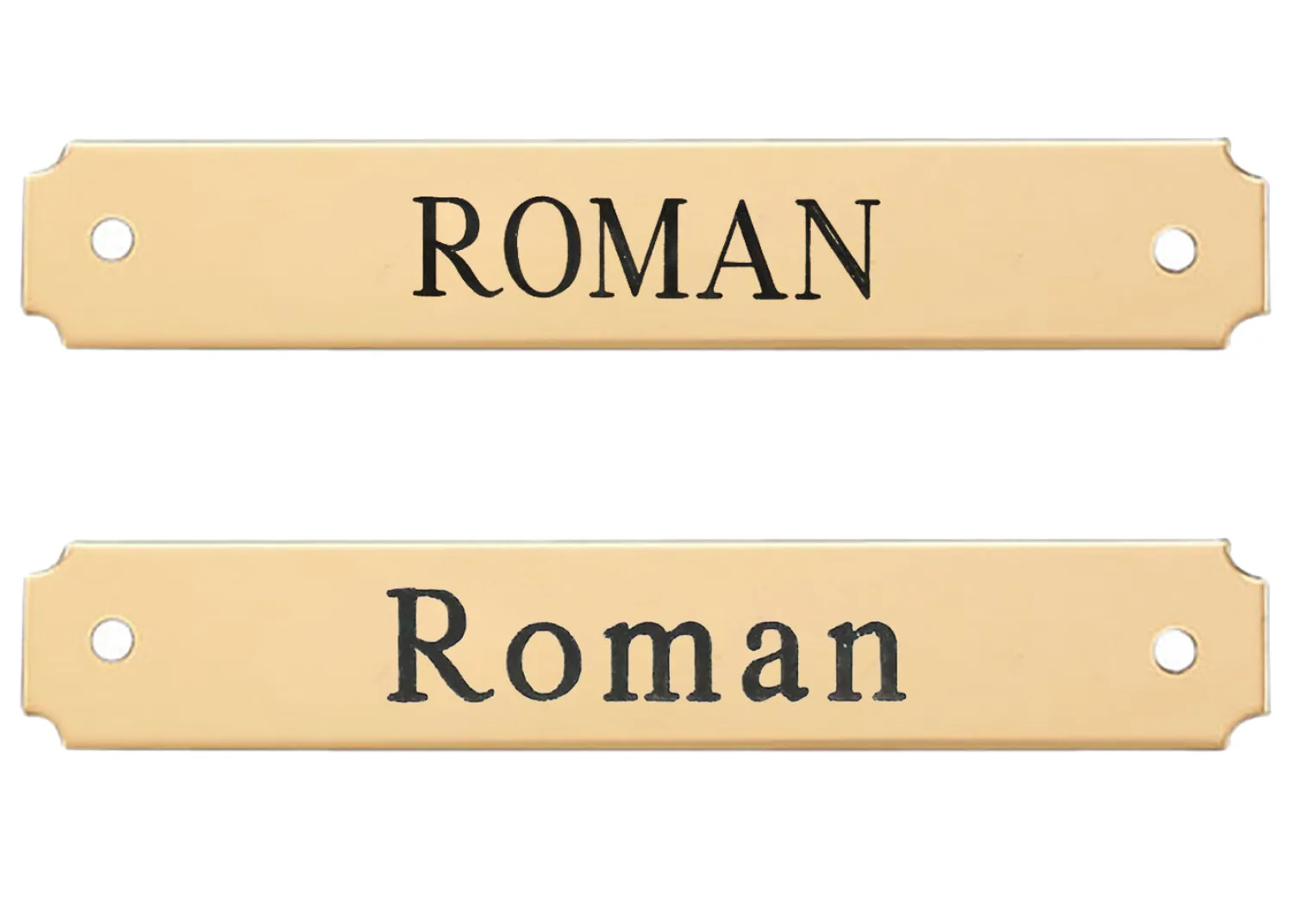Our Notched Corner Saddle Nameplate in brass or German silver suits any saddle. The plate will be engraved in the USA in your choice Block, Old English, Roman or Script letters with your name or your horse’s name.