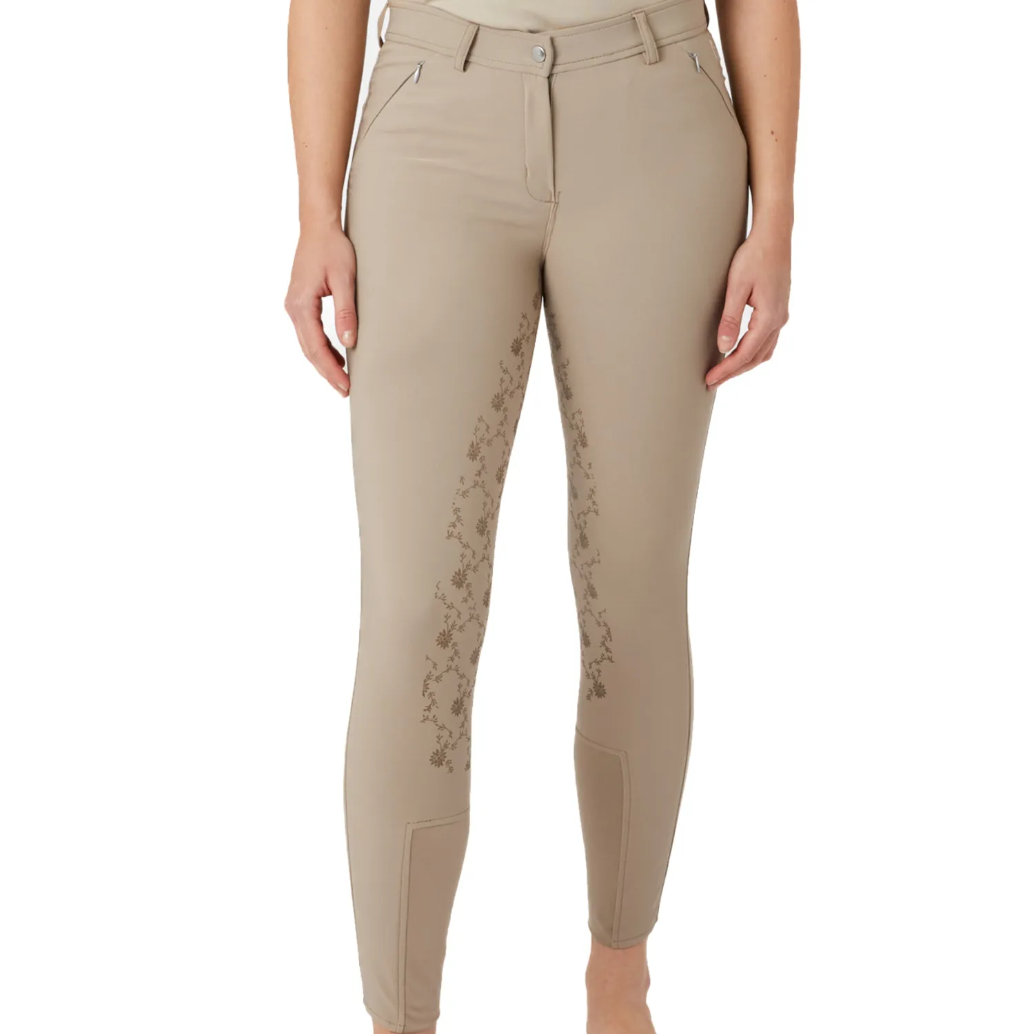 Feminine touches set this Horze Kaitlin Full-Seat Breech apart. Made from soft, stretchy fabric, it has a clean, streamlined look with angled zip front pockets. Back pockets are embroidered with leaves, and the silicone print full seat has a coordinating floral motif.