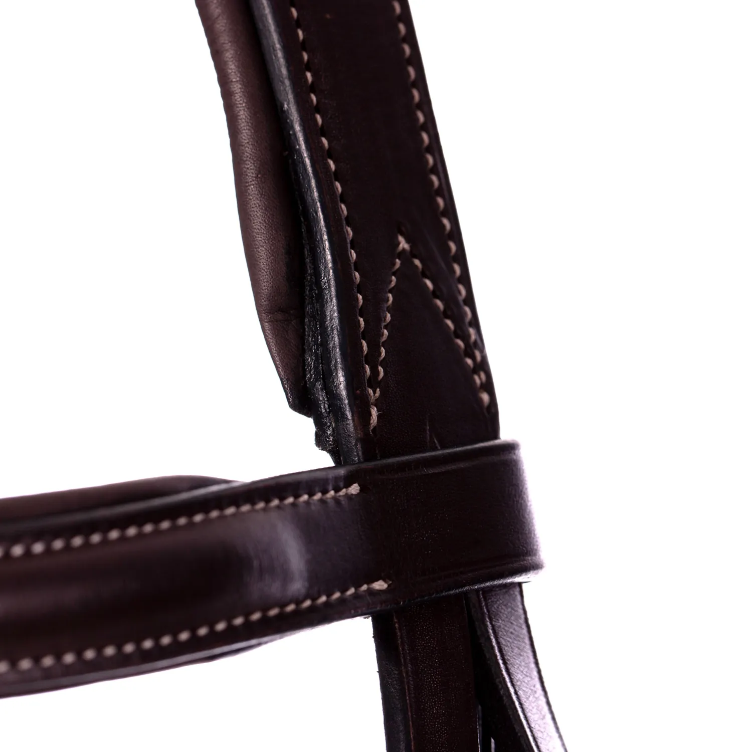 The Valkyrie Fancy-Stitched Figure-8 Bridle with reins comes in a beautiful, traditional, rich chocolate brown leather color. The single crownpiece design places padding only against the horse’s poll. It’s also slightly wider than a traditional crown to help disperse pressure over a larger area of the poll for extra comfort.