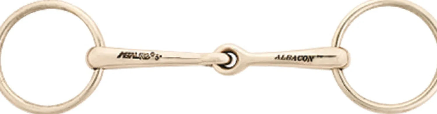 The AlBaCon™ Bradoon Bit is made from copper enhanced German Silver to help stimulate salivation and encourage bit acceptance. The high copper formula also helps prevent dry mouth, yet retains the appearance and durability of German Silver. 13mm mouthpiece with 55mm rings.
