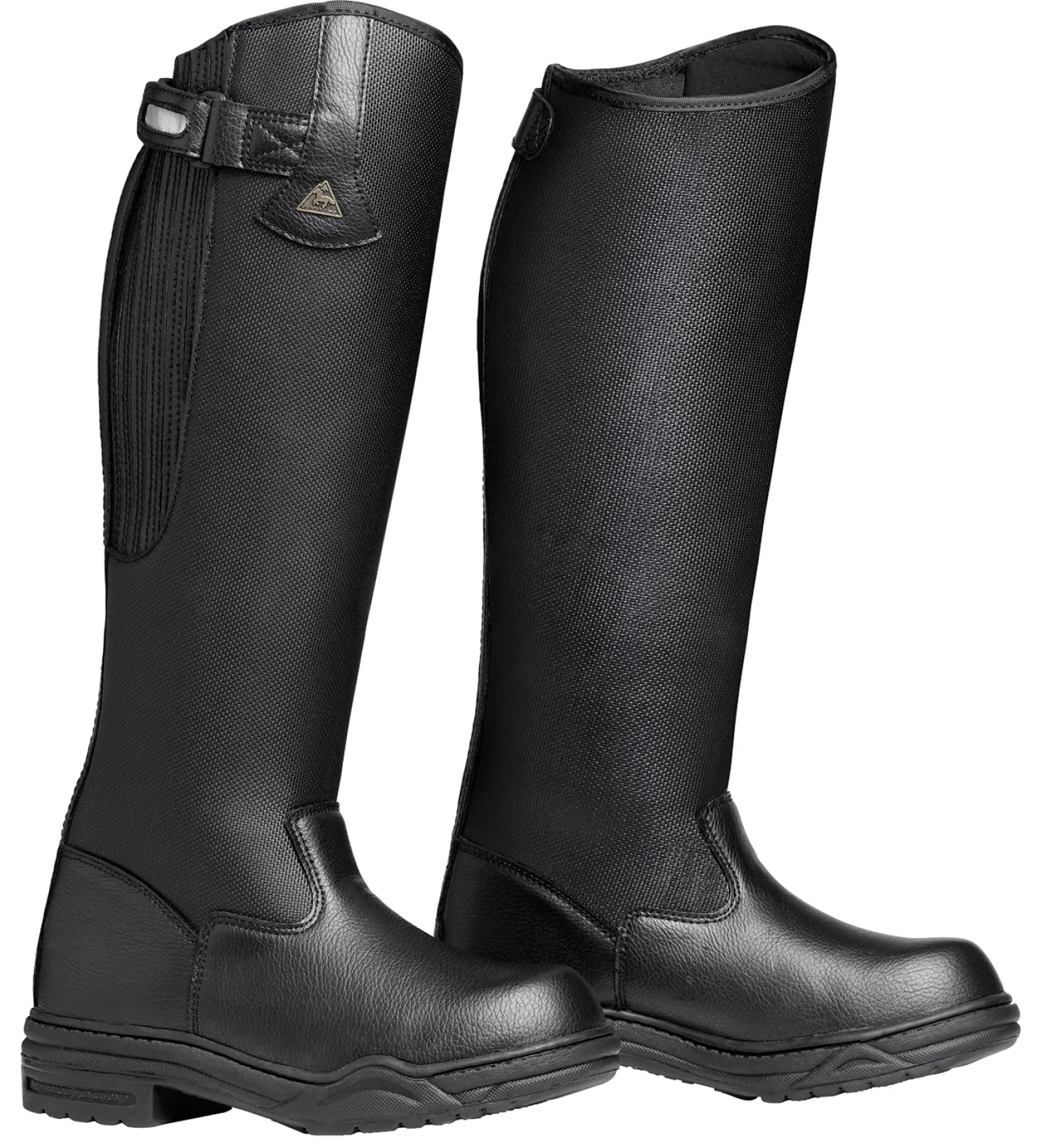 A perennial winter favorite returns in the Mountain Horse® Ladies’ Rimfrost Rider III. Built with a hard-wearing Duralon upper, this tall winter riding boot is equipped with Extensia, a unique material that withstands more than 1,000,000 flexes in 14°F/-10°C. Waterproof construction by the use of cell-sealing cement technology keeps your foot dry up to the base of the zipper. A heat insulating Thermolite® lining keeps leg and foot warm. Strong and durable YKK® rear zipper is bordered on one side by an elastic panel for an individual fit. Ergonomically-designed removable EVA™ insole. Built-in 850°C steel shank for improved stability while riding and walking. Heel is fitted with shock-absorbing IPS system, which helps to reduce the impact of walking or doing stable work.