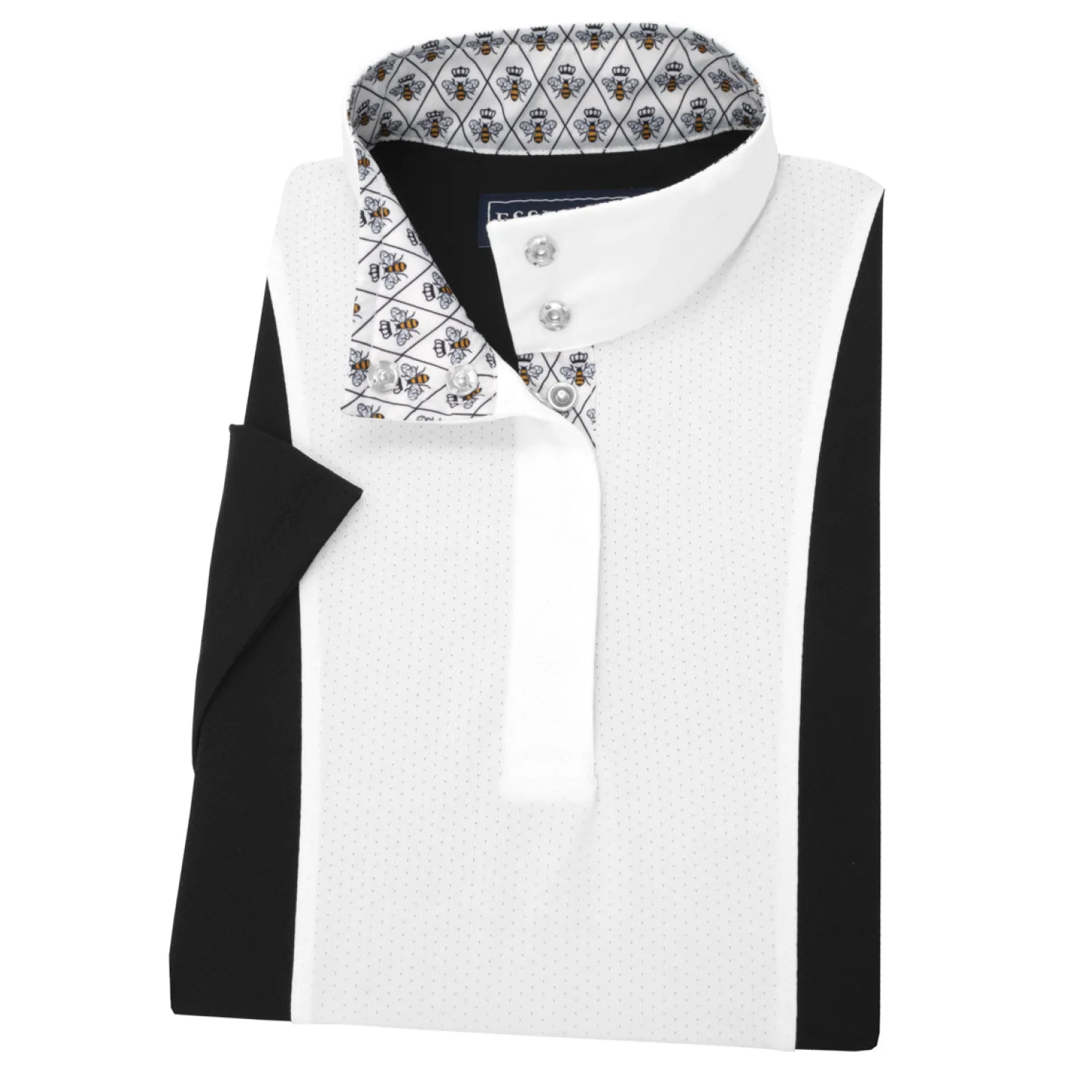 This pullover children’s show top features a white, full-length panel front with crisp white show collar that looks classic under a show coat. Solid sides and back and print trim details offer great style.