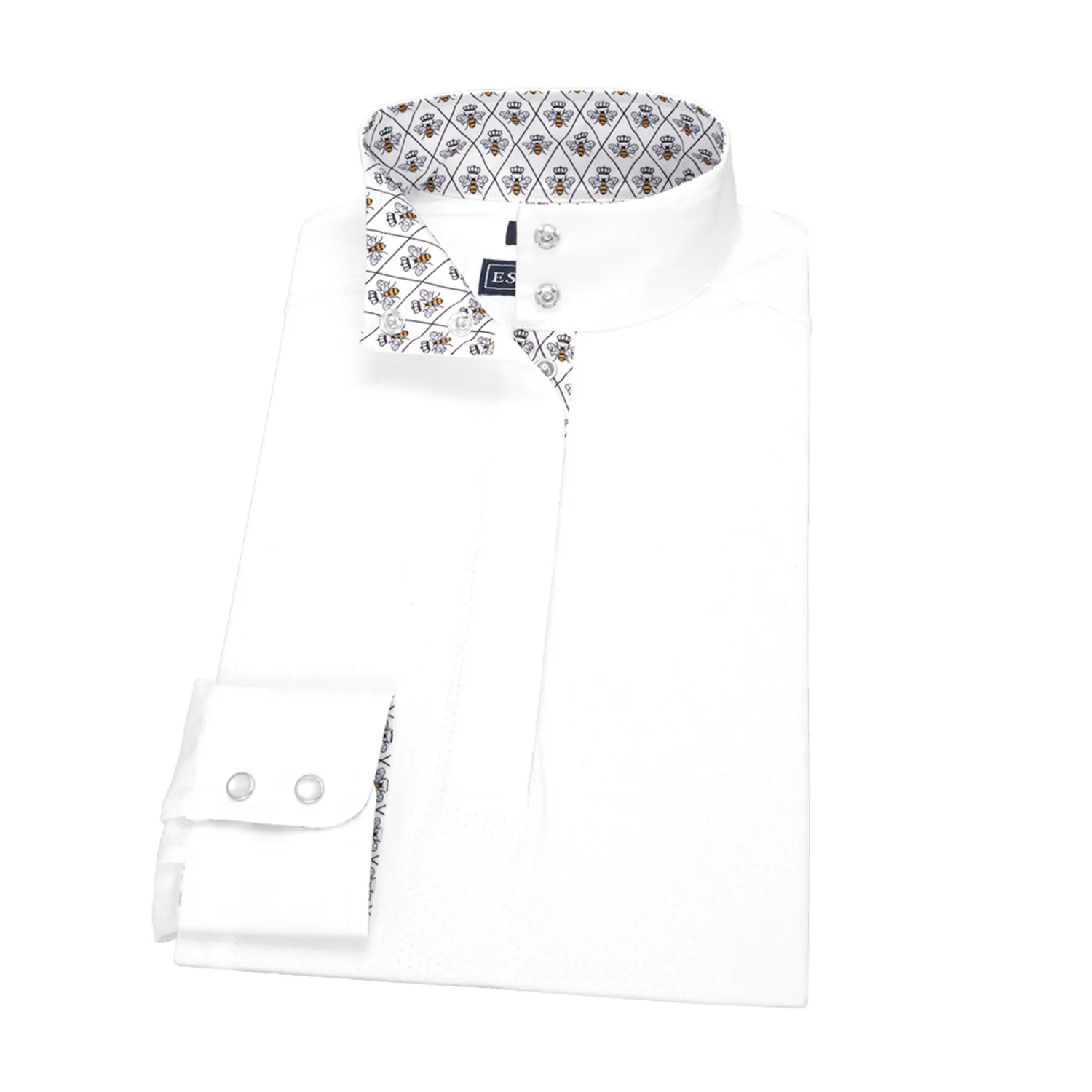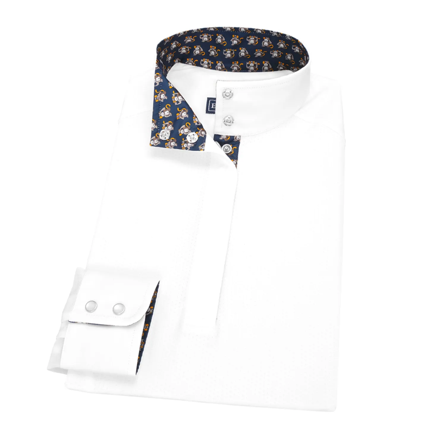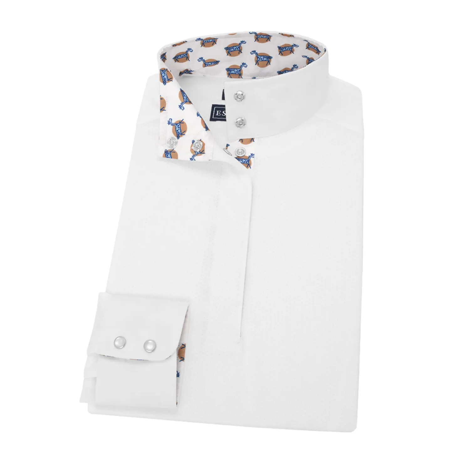 This Talent Yarn® Straight Collar Long Sleeve Show Shirt is made for those riders preferring a straight-up cut collar rather than an angled wrap collar. Like all Talent Yarn show shirts, it wicks moisture, provides antibacterial deodorizing and helps protect skin from the sun. Thermoregulating properties help keep the rider cool; Scotchgard® stain resistance makes it easy-care.