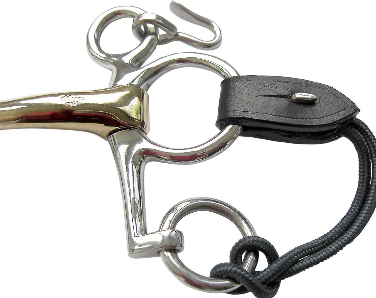 An innovative and easy-to-use converter strap, the Herm Sprenger®Pelham Converter combines the use of nautical grade nylon rope and leather. The rope loops securely around the bottom ring of the Pelham while the leather tab with stainless steel hook stud closure attaches to the middle ring. Leather tab is embossed with the HS® logo. Pair.