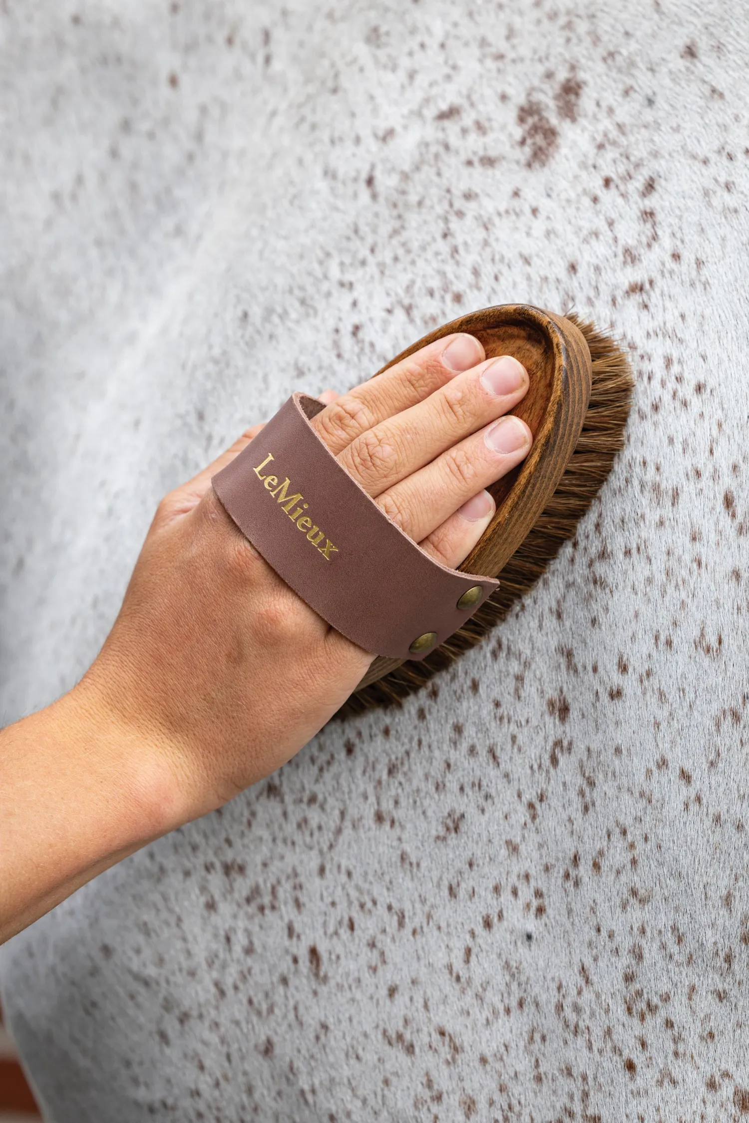 Made from 100% natural anti-static horsehair bristles, the LeMieux® Artisan Soft Speckled Brush provides your horse with a deep yet gentle clean. The leather strap with gold foil embossed branding adds a sophisticated touch, while the solid wooden base offers an ergonomic in-hand fit for enhanced comfort while you brush.