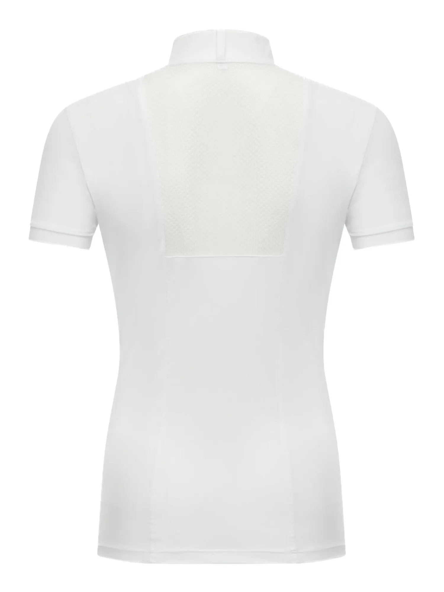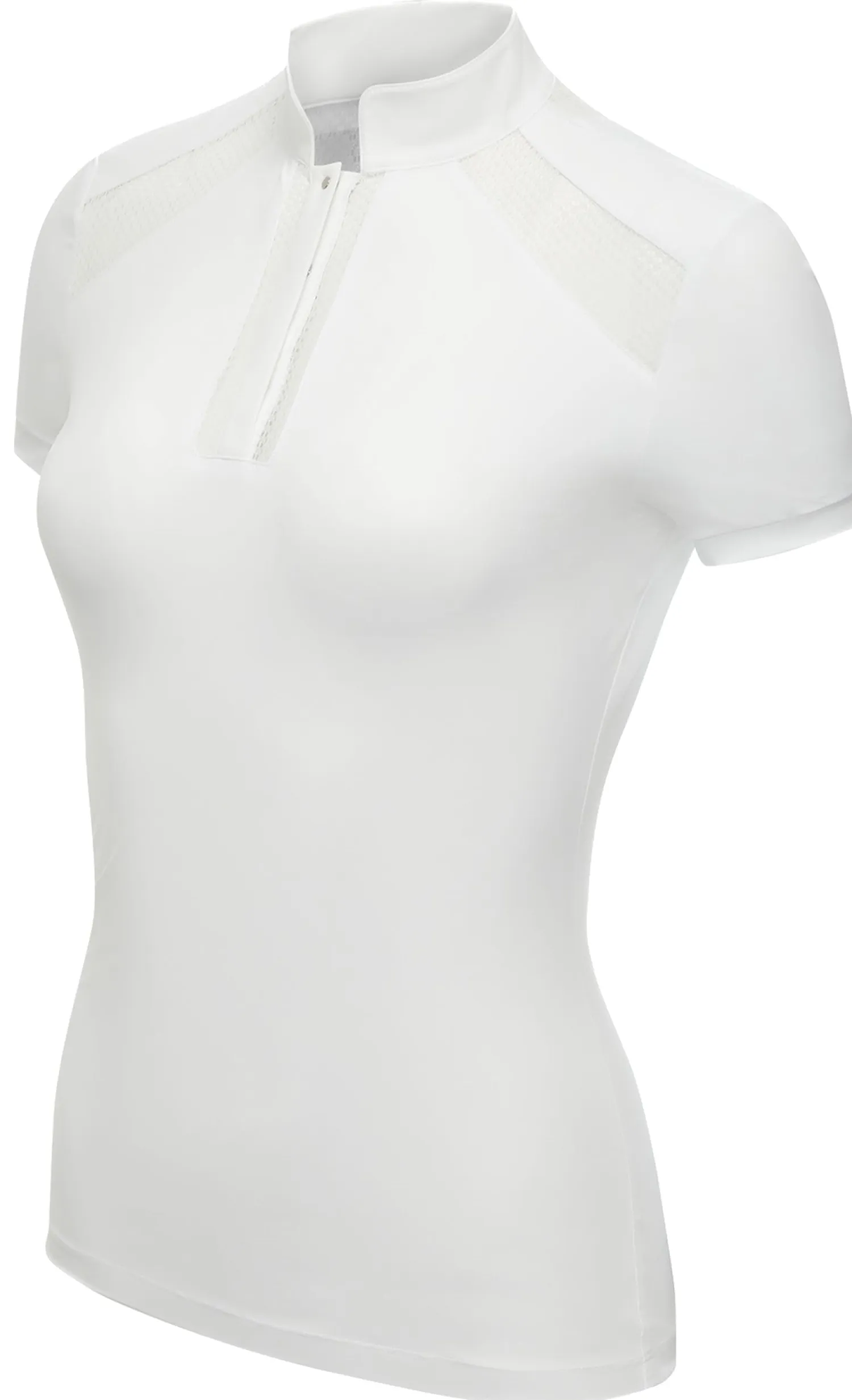 The LeMieux® Camille Short-Sleeve Show Shirt in lightweight, breathable crepe fabric offers performance and comfort. This top creates a feminine silhouette that is perfect under a show coat. Mesh cutouts and mesh under the short sleeves promote air circulation. Stand collar with silicone logo detail and popper closure.