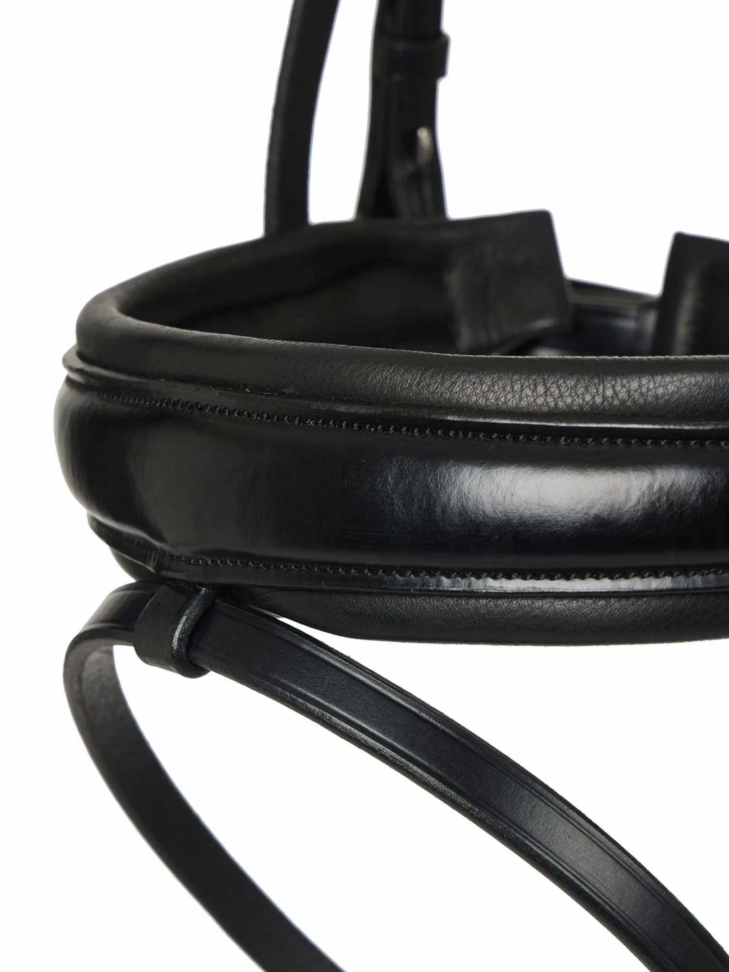 The delicate, beautifully sculpted clincher browband is easily detachable with popper closures. The statement crank noseband is fully cushioned and equipped with a roller buckle, as is the flash strap. Throatlatch secures discreetly with one buckle under the jaw.