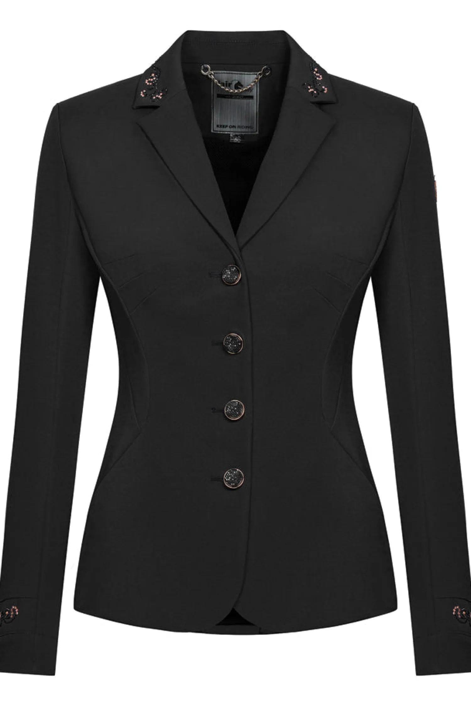The Taylor Chic Show Coat is crafted in Poland and lined with a highly breathable mesh. Discreet eyelets under the armpits let heat escape, while rose gold and tonal crystals accent the collar and cuffs.